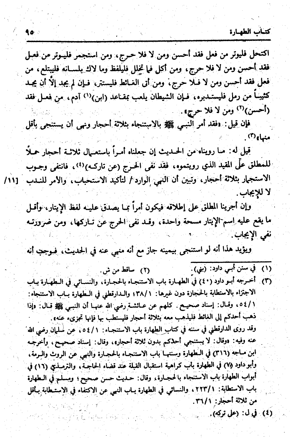 قيل لَهُ: مَا روينَاهُ من الحَدِيث إِن جَعَلْنَاهُ أمرا بِاسْتِعْمَال ثَلَاثَة أَحْجَار حملا للمطلق على الْمُقَيد الَّذِي رويتموه، فقد نفى الْحَرج (عَن تَاركه) ، فَانْتفى وجوب الِاسْتِجْمَار بِثَلَاثَة أَحْجَار، وَتبين أَن النَّهْي الْوَارِد / لتأكيد الِاسْتِحْبَاب، وَالْأَمر للنَّدْب لَا للْإِيجَاب.
