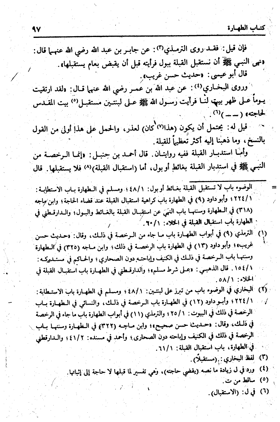 وروى البُخَارِيّ: عَن عبد الله بن عمر رَضِي الله عَنْهُمَا قَالَ: " لقد ارتقيت يَوْمًا على ظهر بَيت لنا فَرَأَيْت رَسُول الله [صلى الله عَلَيْهِ وَسلم] على لبنتين مُسْتَقْبل بَيت الْمُقَدّس لِحَاجَتِهِ ".