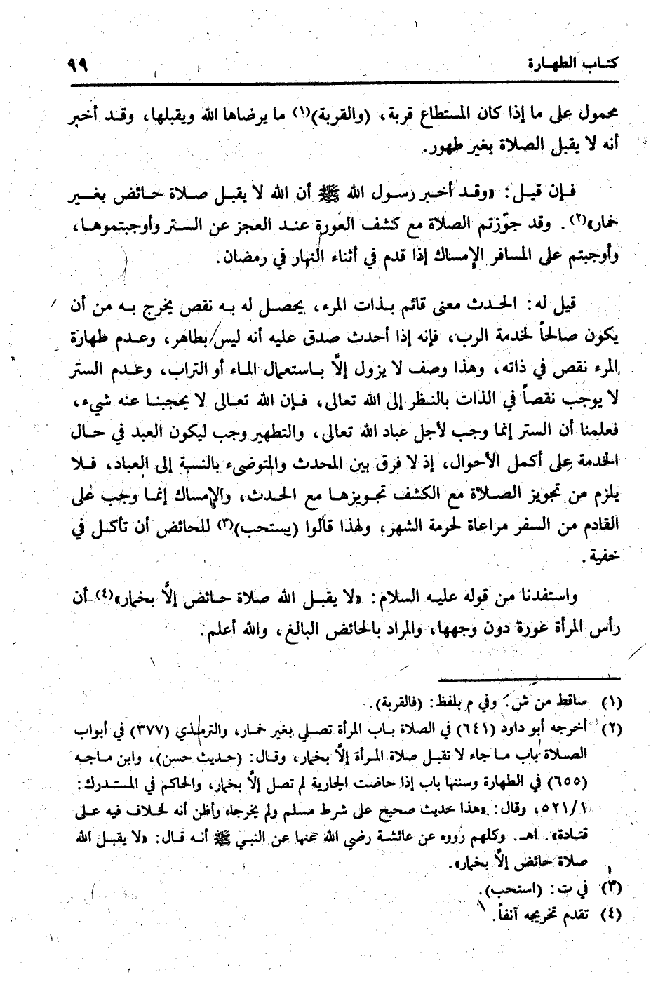 قيل لَهُ: الْحَدث معنى قَائِم بِذَات الْمَرْء، يحصل لَهُ بِهِ نقص يخرج بِهِ من أَن يكون صَالحا لخدمة الرب، فَإِنَّهُ إِذا أحدث صدق عَلَيْهِ أَنه لَيْسَ بطاهر، وَعدم طَهَارَة الْمَرْء نقص فِي ذَاته، وَهَذَا وصف لَا يَزُول إِلَّا بِاسْتِعْمَال المَاء أَو التُّرَاب، وَعدم السّتْر لَا يُوجب نقصا فِي الذَّات بِالنّظرِ إِلَى الله تَعَالَى، فَإِن الله تَعَالَى لَا يحجبنا عَنهُ شَيْء، فَعلمنَا أَن السّتْر إِنَّمَا وَجب لأجل عباد الله تَعَالَى، والتطهير وَجب ليَكُون العَبْد فِي حَال الْخدمَة على: أكمل الْأَحْوَال، إِذْ لَا فرق بَين الْمُحدث والمتوضئ بِالنِّسْبَةِ إِلَى الْعباد، فَلَا يلْزم من تَجْوِيز الصَّلَاة مَعَ الْكَشْف تجويزها مَعَ الْحَدث، والإمساك إِنَّمَا وَجب على القادم من السّفر مُرَاعَاة لحُرْمَة الشَّهْر، وَلِهَذَا قَالُوا (يسْتَحبّ) للحائض أَن تَأْكُل فِي خُفْيَة.
