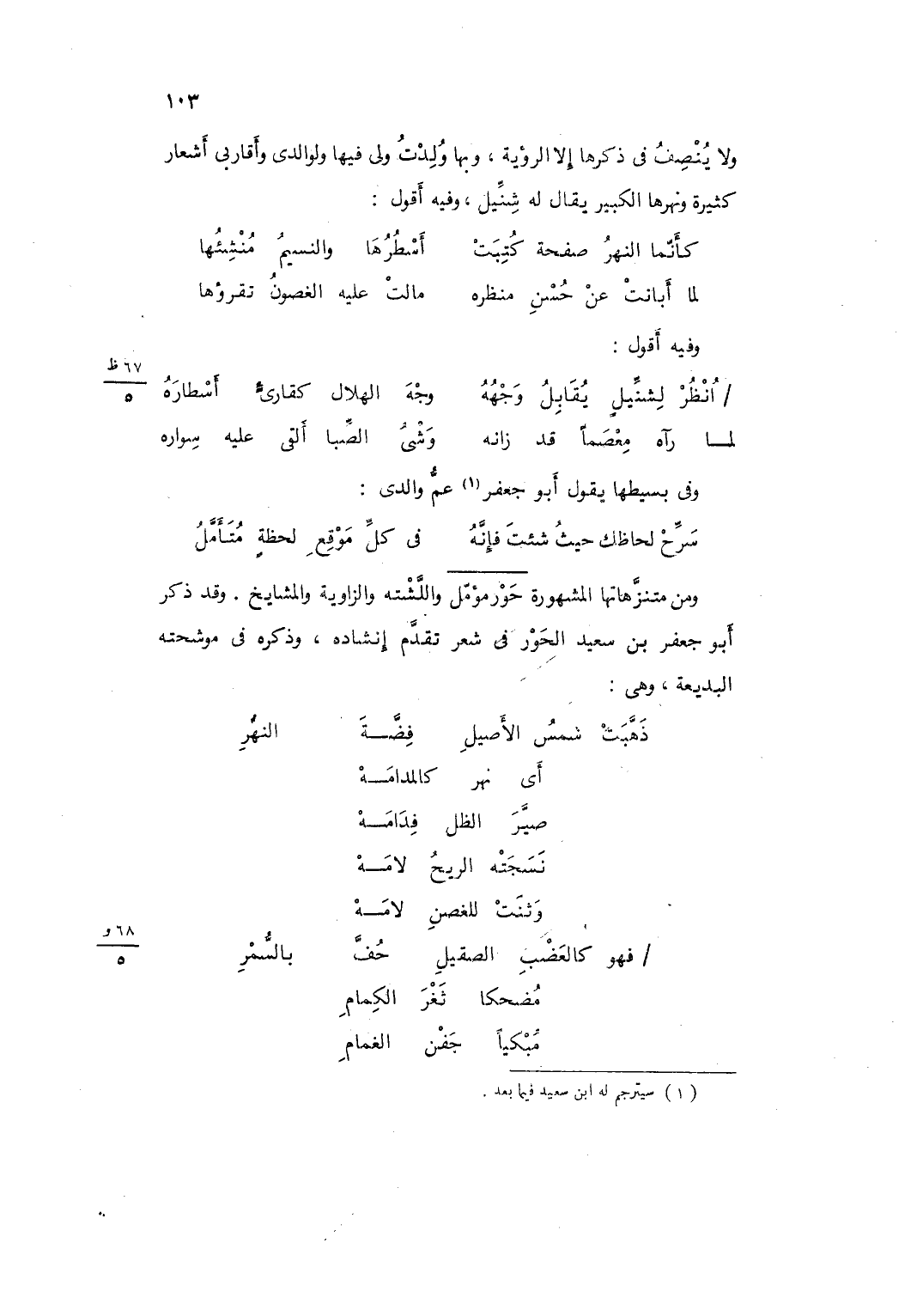 وَفِيه أَقُول ... انْظُرْ لِشَنَّيلٍ يُقَابِلُ وَجْهَهُ ... وَجْهَ الهِلالِ كَقَارِئٍ أَسْطَارَهُ