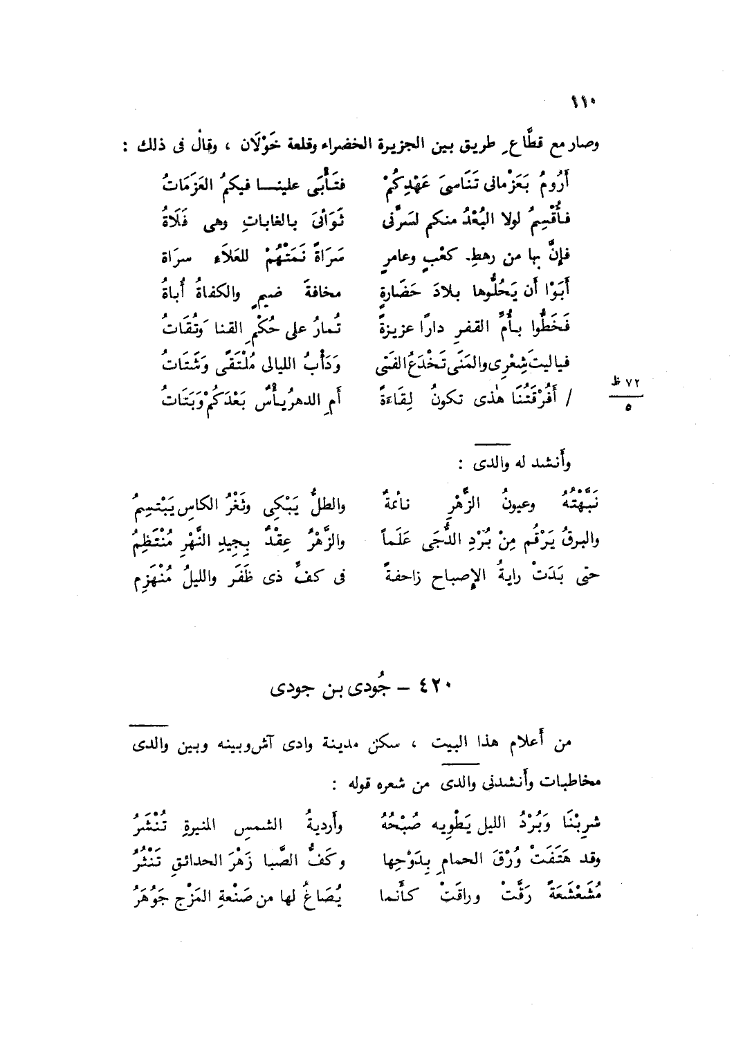 420 - جودي بن جودي من أَعْلَام هَذَا الْبَيْت سكن مَدِينَة وَادي آش وَبَينه وَبَين وَالِدي مخاطبات وأنشدني وَالِدي من شعره قَوْله ... شربنا وَبرد اللَّيْل يطويه صبحه ... وأردية الشَّمْسِ المُنِيرَةِ تُنْشَرُ