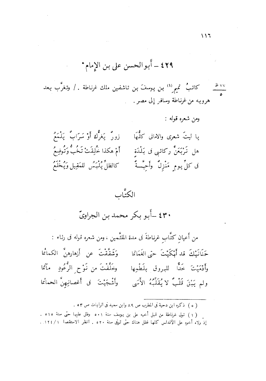 من أَعْيَان كتاب غرناطة فِي مُدَّة الملثمين وَمن شعره قَوْله فِي رثاء ... حنانيك قد أبكيت حَتَّى الغمائما ... وشققت عَن ازهارهن الكمائما