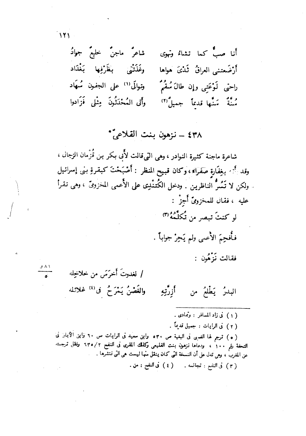 فَقَالَت نزهون ... لَغَدَوْتَ أَخْرَسَ مِنْ خَلاَخِلِهِ