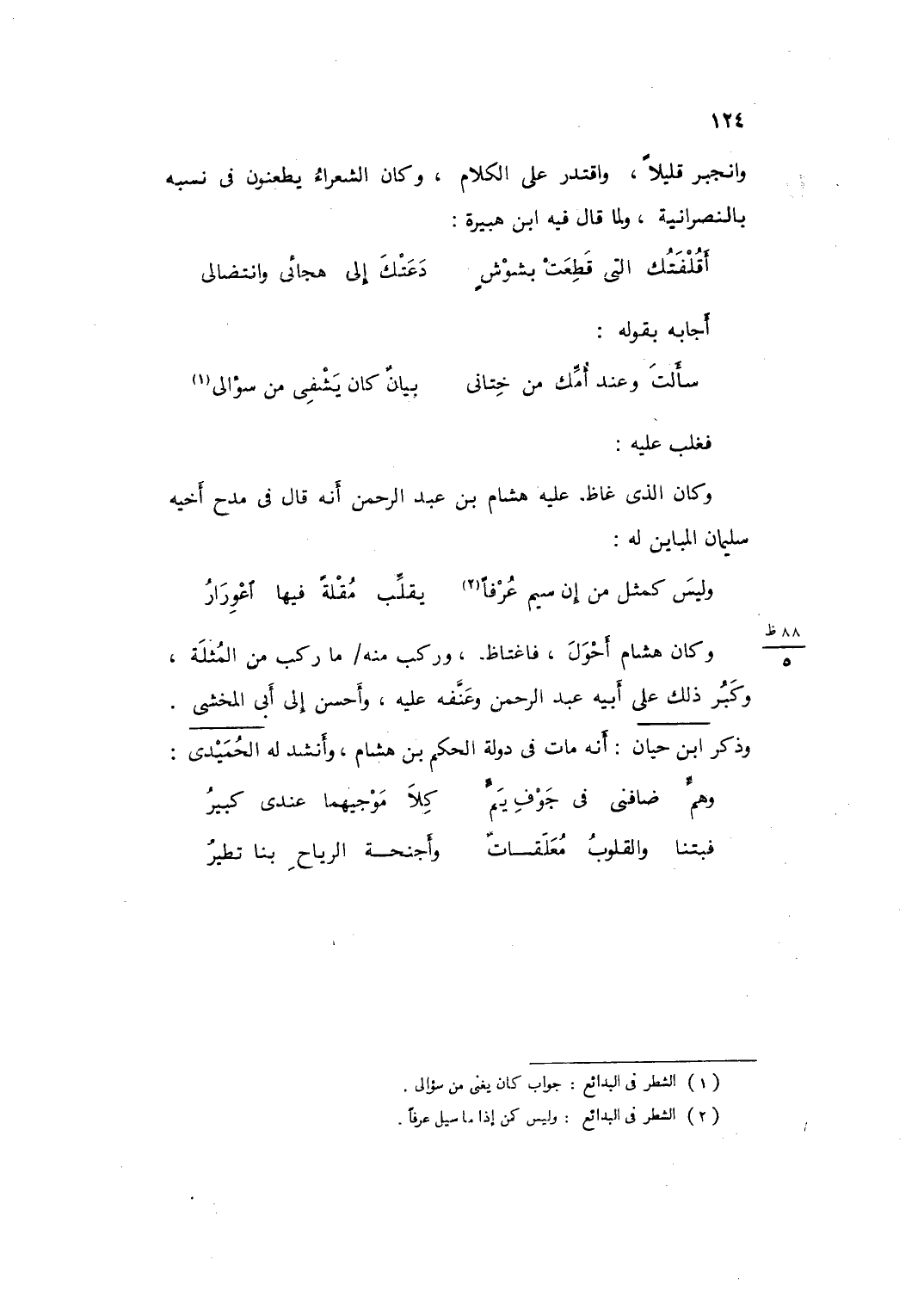وانجبر قَلِيلا واقتدر على الْكَلَام وَكَانَ الشُّعَرَاء يطعنون فِي نسبه بالنصرانية وَلما قَالَ فِيهِ ابْن هُبَيْرَة ... أقُلْفَتُكَ الَّتِي قُطِعَتْ بِشَوْشٍ ... دَعَتْكَ إلَى هَجَائِي وَانْتِضَالِي ...