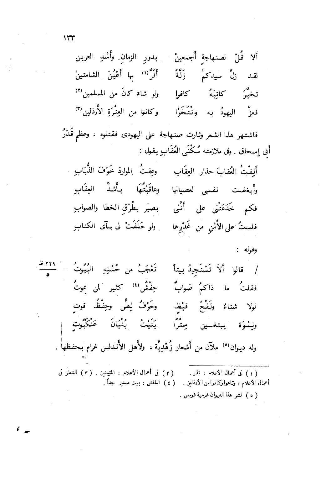 فاشتهر هَذَا الشّعْر وثارت صنهاجة على الْيَهُود فَقَتَلُوهُ وَعظم قدر أبي إِسْحَاق وَفِي ملازمته سُكْنى الْعقَاب يَقُول ... أَلِفْتُ العُقَابَ حَذَارِ العِقَابِ ... وَعِفْتُ المَوَارِدَ خَوْفَ الذُّبَابِ