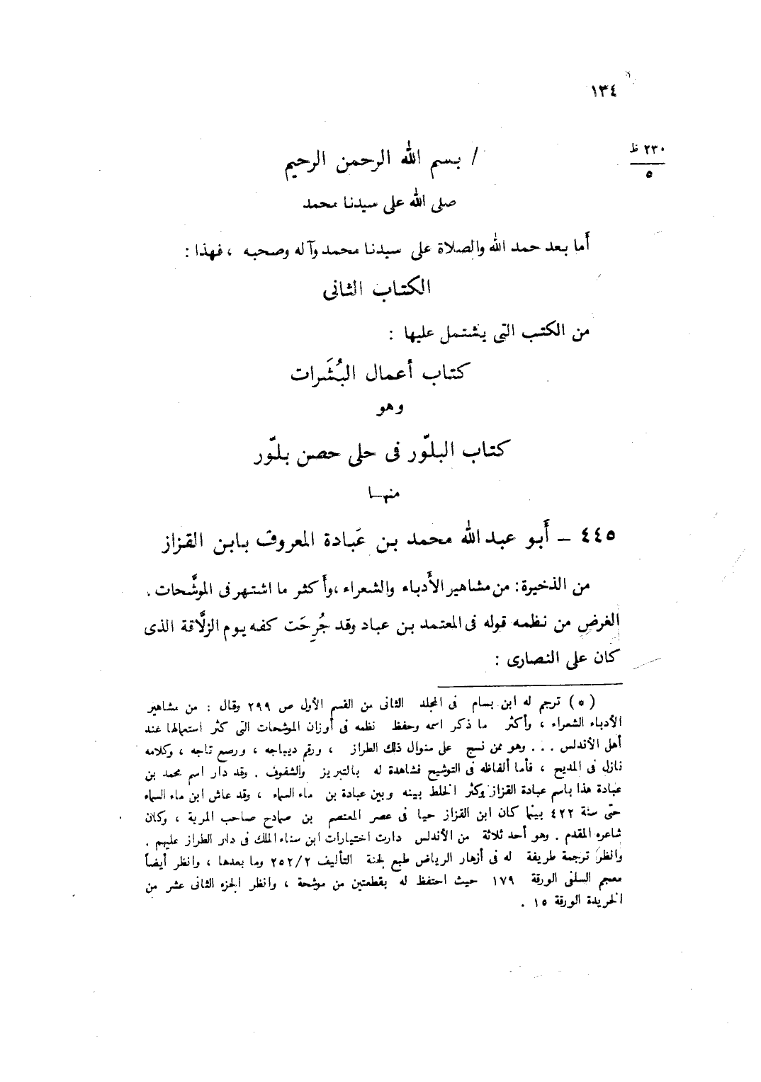 بِسم الله الرَّحْمَن الرَّحِيم صلى الله على سيدنَا مُحَمَّد أما بعد حمد الله وَالصَّلَاة على سيدنَا مُحَمَّد وَآله وَصَحبه فَهَذَا الْكتاب الثَّانِي من الْكتب الَّتِي يشْتَمل عَلَيْهَا كتاب أَعمال البشرات وَهُوَ كتاب البلور فِي حلي حصن بلور مِنْهَا