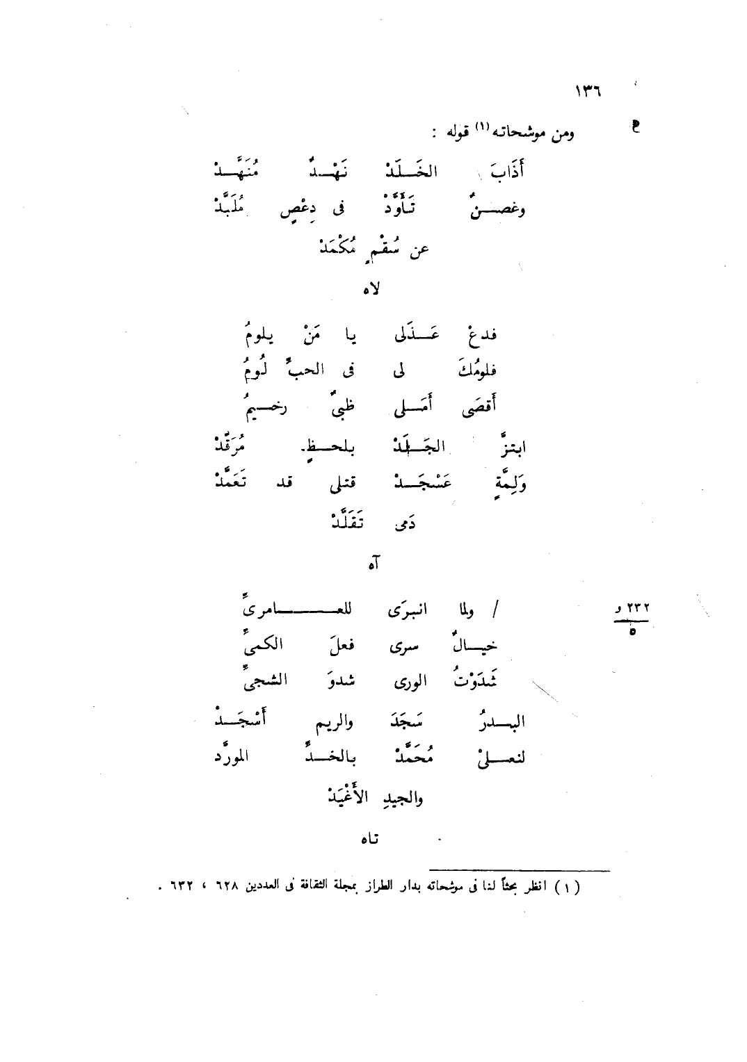 وَمن موشحاته قَوْله ... أَذَابَ الخَلَدْ نَهْدٌ مُنَهَّدْ