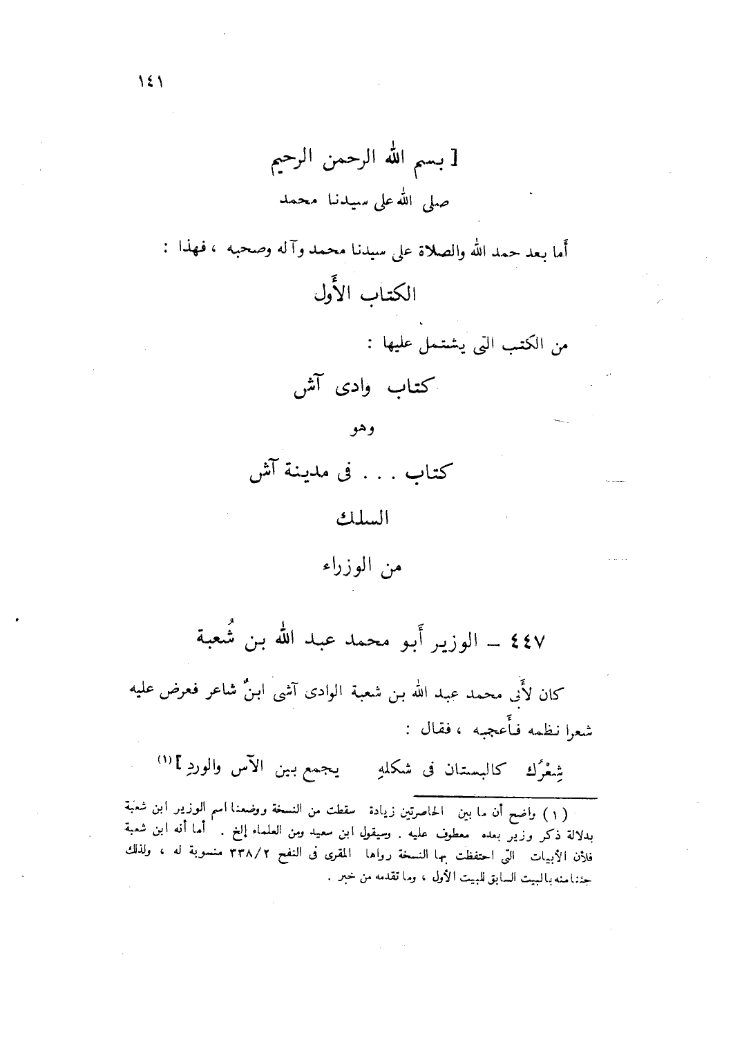 بِسم الله الرَّحْمَن الرَّحِيم صلى الله على سيدنَا مُحَمَّد أما بعد حمد الله وَالصَّلَاة على سيدنَا مُحَمَّد وَآله وَصَحبه فَهَذَا الْكتاب الأول من الْكتب الَّتِي يشْتَمل عَلَيْهَا كتاب وَادي آش وَهُوَ كتاب فِي مَدِينَة آش