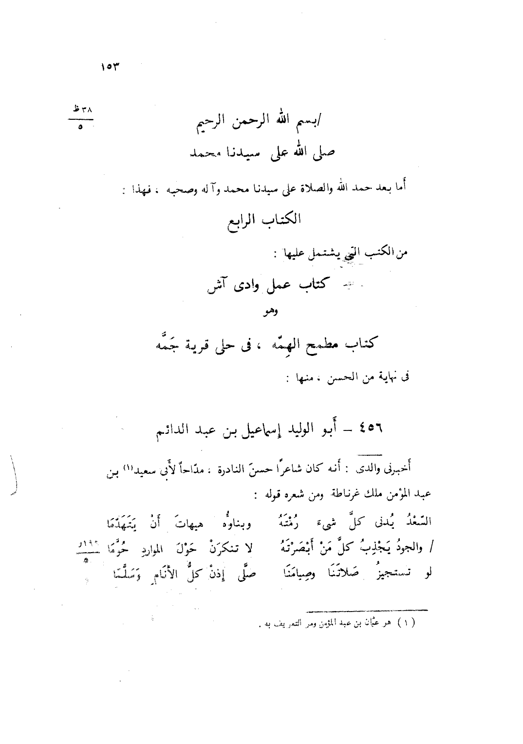 بِسم الله الرَّحْمَن الرَّحِيم صلى الله على سيدنَا مُحَمَّد أما بعد حمد الله وَالصَّلَاة على سيدنَا مُحَمَّد وَآله وَصَحبه فَهَذَا الْكتاب الرَّابِع من الْكتب الَّتِي يشْتَمل عَلَيْهَا كتاب عمل وَادي آش وَهُوَ كتاب مطمح الهمة فِي حلي قَرْيَة جمة فِي نِهَايَة من الْحسن مِنْهَا