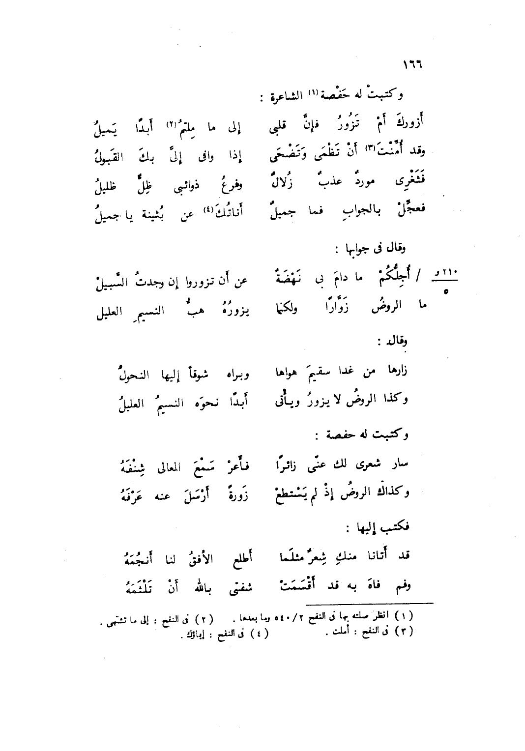 وكتبت لَهُ حَفْصَة الشاعرة ... أَزُورُكَ أَمْ تَزُورُ فَإِنَّ قَلْبِي ... إِلَى مَا مِلْتُمْ أَبَدَاً يَمِيلُ