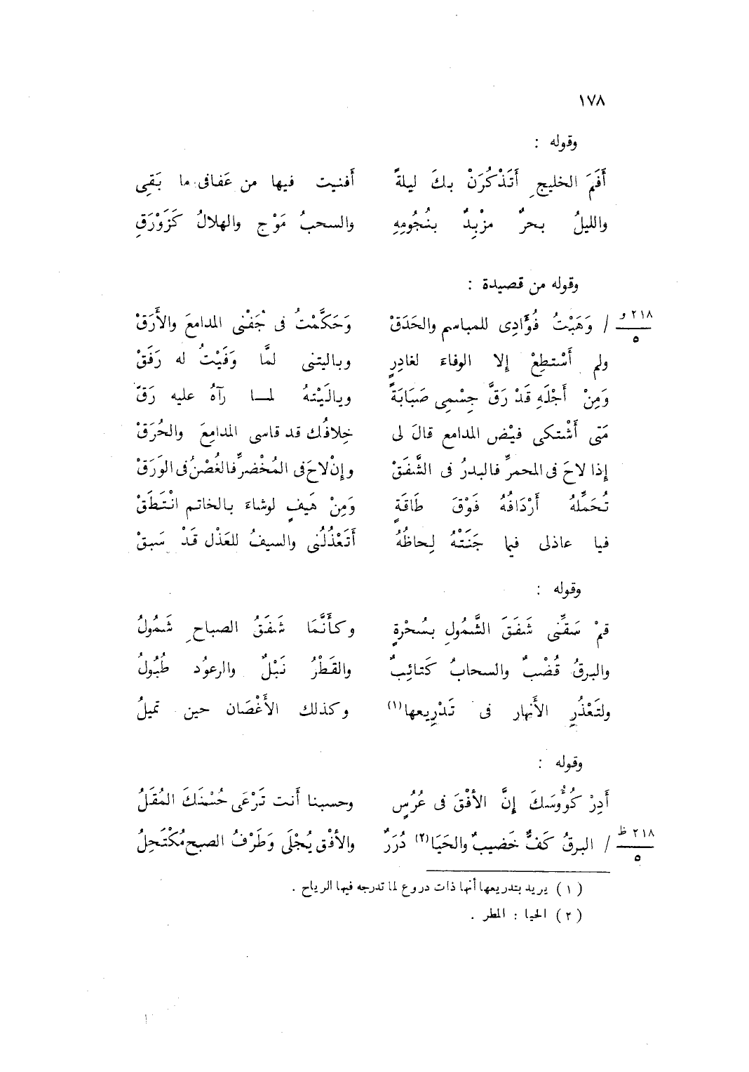 وَقَوله ... أَدِرْ كُؤُوسَكَ إِنَّ الأُفْقَ فِي عرس ... وحسبنا أنْتَ تَرْعَى حُسْنَكَ المُقَلُ