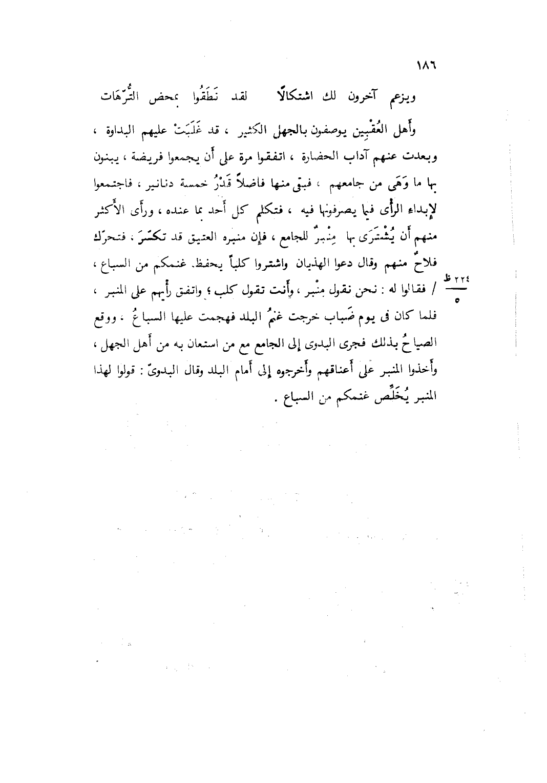 وَأهل العقبين يوصفون بِالْجَهْلِ الْكثير قد غلبت عَلَيْهِم البداوة وبعدت عَنْهُم آدَاب الحضارة اتَّفقُوا مرّة على أَن يجمعوا فَرِيضَة يبنون بهَا مَا وهى من جامعهم فَبَقيَ مِنْهَا فَاضلا قدر خَمْسَة دَنَانِير فَاجْتمعُوا لإبداء الرَّأْي فِيمَا يصرفونها فِيهِ فَتكلم كل أحد بِمَا عِنْده وَرَأى الْأَكْثَر مِنْهُم أَن يشترى بهَا مِنْبَر للجامع فغن منبره الْعَتِيق قد تكسر فَتحَرك فلاح مِنْهُم وَقَالَ دعوا الهذيان واشتروا كَلْبا يحفظ غنمكم من السبَاع فَقَالُوا لَهُ نَحن نقُول مِنْبَر وَأَنت تَقول كلب وَاتفقَ رَأْيهمْ على الْمِنْبَر فَلَمَّا كَانَ فِي يَوْم ضباب خرجت غنم الْبَلَد فهجمت عَلَيْهَا السبَاع وَوَقع الصياح بذلك فَجرى البدوي إِلَى الْجَامِع مَعَ من اسْتَعَانَ بِهِ من أهل الْجَهْل وَأخذُوا الْمِنْبَر على أَعْنَاقهم وأخرجوه إِلَى أَمَام الْبَلَد وَقَالَ البدوي قُولُوا لهَذَا الْمِنْبَر يخلص غنكم من السبَاع