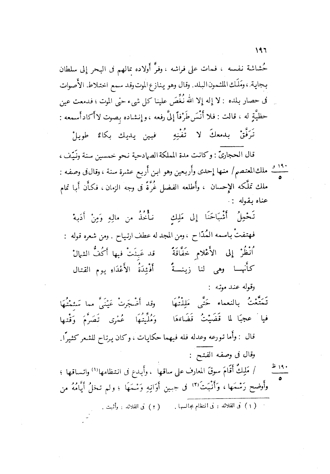 قَالَ الحجاري وَكَانَت مُدَّة المملكة الصمادحية نَحْو خمسين سنة ونيف ملك المعتصم مِنْهَا إِحْدَى وَأَرْبَعين وَهُوَ ابْن أَربع عشرَة سنة وَقَالَ فِي وَصفه ملك تملكه الْإِحْسَان وأطلعه الْفضل غرَّة فِي وَجه الزَّمَان فَكَأَن أَبَا تَمام عناه بقوله ... تَحْمِلُ أَشْبَاحَنَا إِلَى مَلِكٍ ... نَأْخُذُ مِنْ مَالِهِ وَمِنْ أَدَبِهْ ...