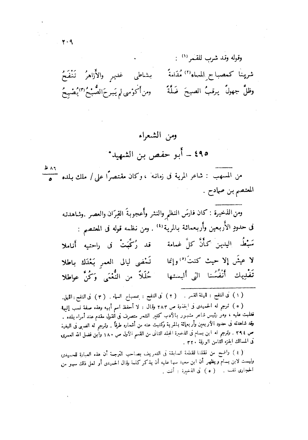 وَمن الذَّخِيرَة كَانَ فَارس النّظم والنثر وأعجوبة الْقرَان وَالْعصر وشاهدته فِي حُدُود الْأَرْبَعين وَأَرْبَعمِائَة بالمرية وَمن نظمه قَوْله فِي المعتصم ... وسبط اليَدَيْنِ كَأَنَّ كُلَّ غَمَامَةٍ ... قَدْ رُكِّبَتْ فِي رَاحَتَيْهِ أَنَامِلا
