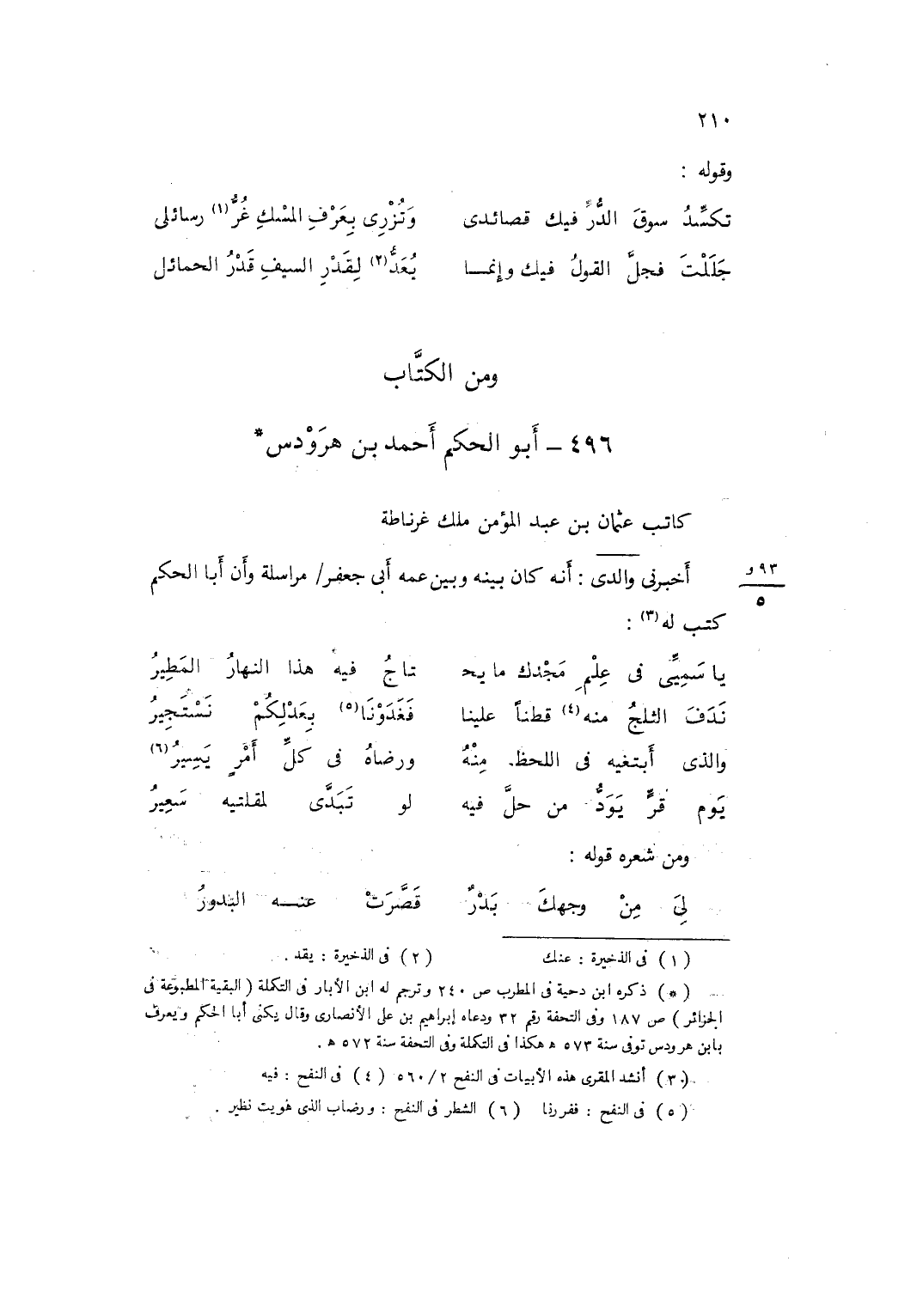 496 - أَبُو الحكم أَحْمد بن هرودس كَاتب عُثْمَان بن عبد الْمُؤمن ملك غرناطة أَخْبرنِي وَالِده أَنه كَانَ بَينه وَبَين عَمه أبي جَعْفَر مراسلة وَأَن أَبَا الحكم كتب لَهُ ... يَا سَمِيِّيِ فِي عِلْمِ مَجْدِكَ مَا يَحْ ... تَاجُ فِيهِ هَذَا النَّهَارُ المَطِيرُ
