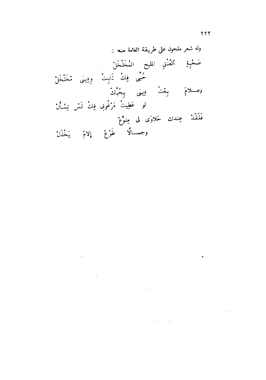 ... فَلَقَدْ عِنْدَكْ حَلاوَى لِي مِنَوَّعْ ... وجَمَالاً طَوْعْ إلامَ يَخْذَلْ ...