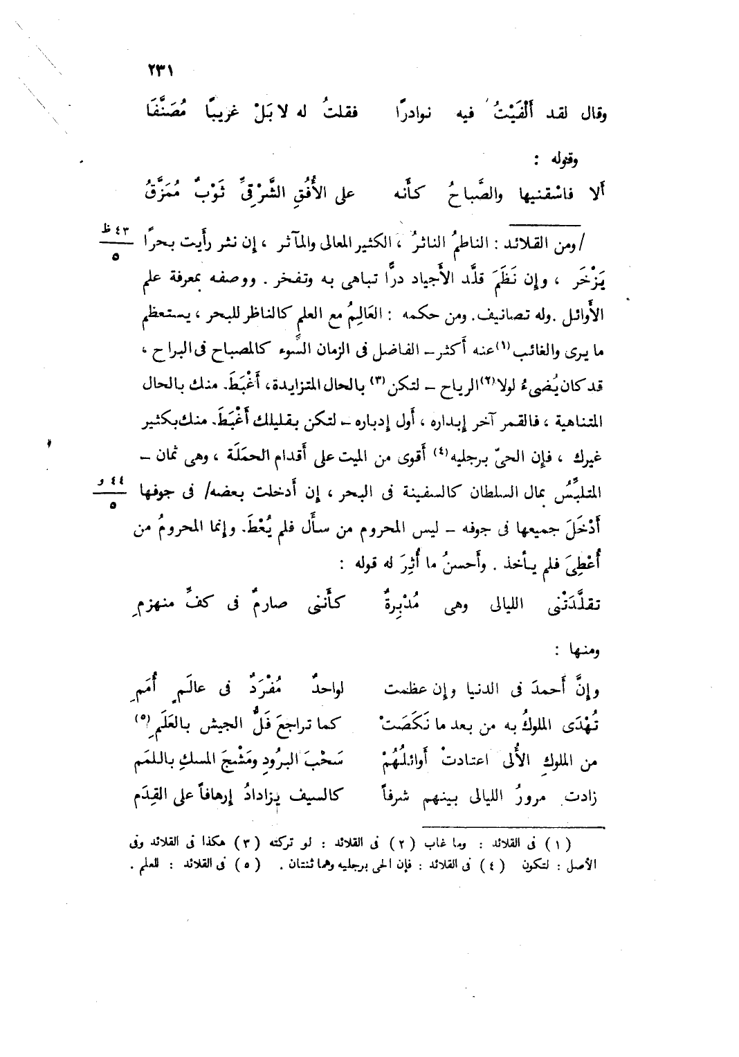 وَمن القلائد النَّاظِم الناثر الْكثير الْمَعَالِي والمآثر إِن نثر رَأَيْت بحراً يزخر وَإِن نظم قلد الأجياد درا تباهي بِهِ وتفخر وَوَصفه بِمَعْرِِفَة علم الْأَوَائِل وَله تصانيف وَمن حكمه الْعَالم مَعَ الْعلم كالناظر للبحر يستعظم مَا يرى وَالْغَائِب عَنهُ أَكثر الْفَاضِل فِي الزَّمَان السوء كالمصباح فِي البراح قد كَانَ يضئ لَوْلَا الرِّيَاح لتكن بِالْحَال المتزايدة أغبط مِنْك بِالْحَال المتناهية فالقمر آخر إبداره أول إدباره لتكن بقليلك أغبظ مِنْك بِكَثِير غَيْرك فَإِن الْحَيّ برجليه أقوى من الْمَيِّت على أَقْدَام الحملة وَهِي ثَمَان المتلبس بِمَال السُّلْطَان كالسفينة فِي الْبَحْر إِن أدخلت بعضه فِي جوفها أَدخل جَمِيعهَا فِي جَوْفه لَيْسَ المحروم من سَأَلَ فَلم يُعْط وَإِنَّمَا المحروم من أعطي فَلم يَأْخُذ وَأحسن مَا أثر لَهُ قَوْله ... تَقَلَّدَتْنِي اللَّيَالِي وَهِيَ مُدْبِرَةٌ ... كَأَنَّنِي صَارِمٌ فِي كَفِّ مُنْهَزِمِ ...