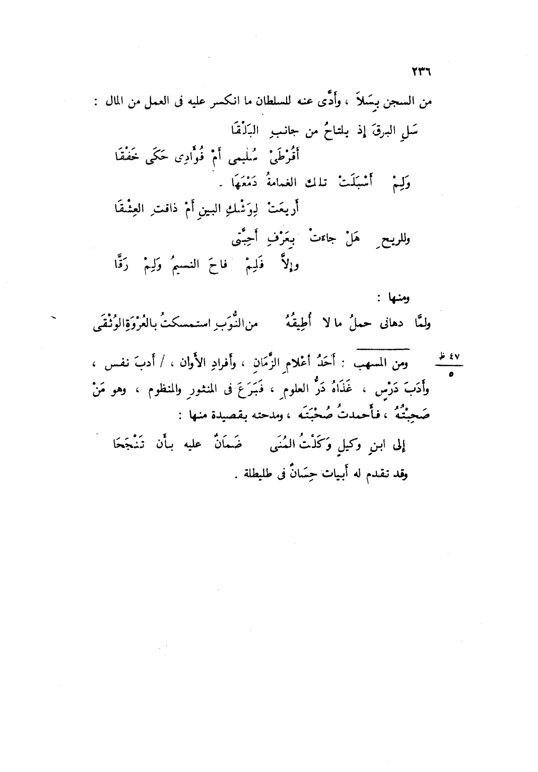 من السجْن بسلا وَأدّى عَنهُ للسُّلْطَان مَا انْكَسَرَ عَلَيْهِ فِي الْعَمَل من المَال ... سَلِ البَّرْقَ إِذْ يَلْتَاحُ من جَانب البلقا ... اقرطي سُلَيْمَى أَمْ فُؤَادِي حَكَى خَفَقَا