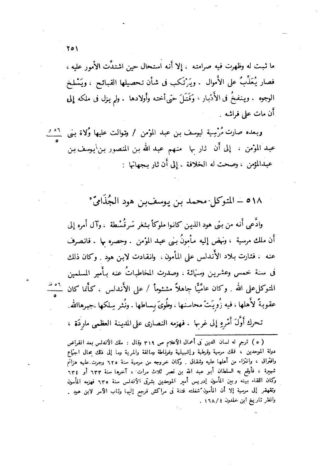 وَادّعى أَنه من بني هود الَّذين كَانُوا ماوكا بثغر سرقسطة وَآل أمره إِلَى أَن ملك مرسية ونهض إِلَيْهِ مَأْمُون بني عبد الْمُؤمن وحصره بهَا فَانْصَرف عَنهُ فثارت بِلَاد الأندلس على الْمَأْمُون وانقادت لِابْنِ هود وَكَانَ ذَلِك فِي سنة خمس وَعشْرين وسِتمِائَة وصدرت المخاطبات عَنهُ بأمير الْمُسلمين المتَوَكل على الله وَكَانَ عاميا جَاهِلا مشئوما على الأندلس كَأَنَّمَا كَانَ عُقُوبَة لأَهْلهَا فِيهِ زويت محاسنها وطوي بساطها ونثر سلكها جبرها الله تحرّك أول أمره إِلَى غربها فَهَزَمَهُ النَّصَارَى على الْمَدِينَة الْعُظْمَى ماردة