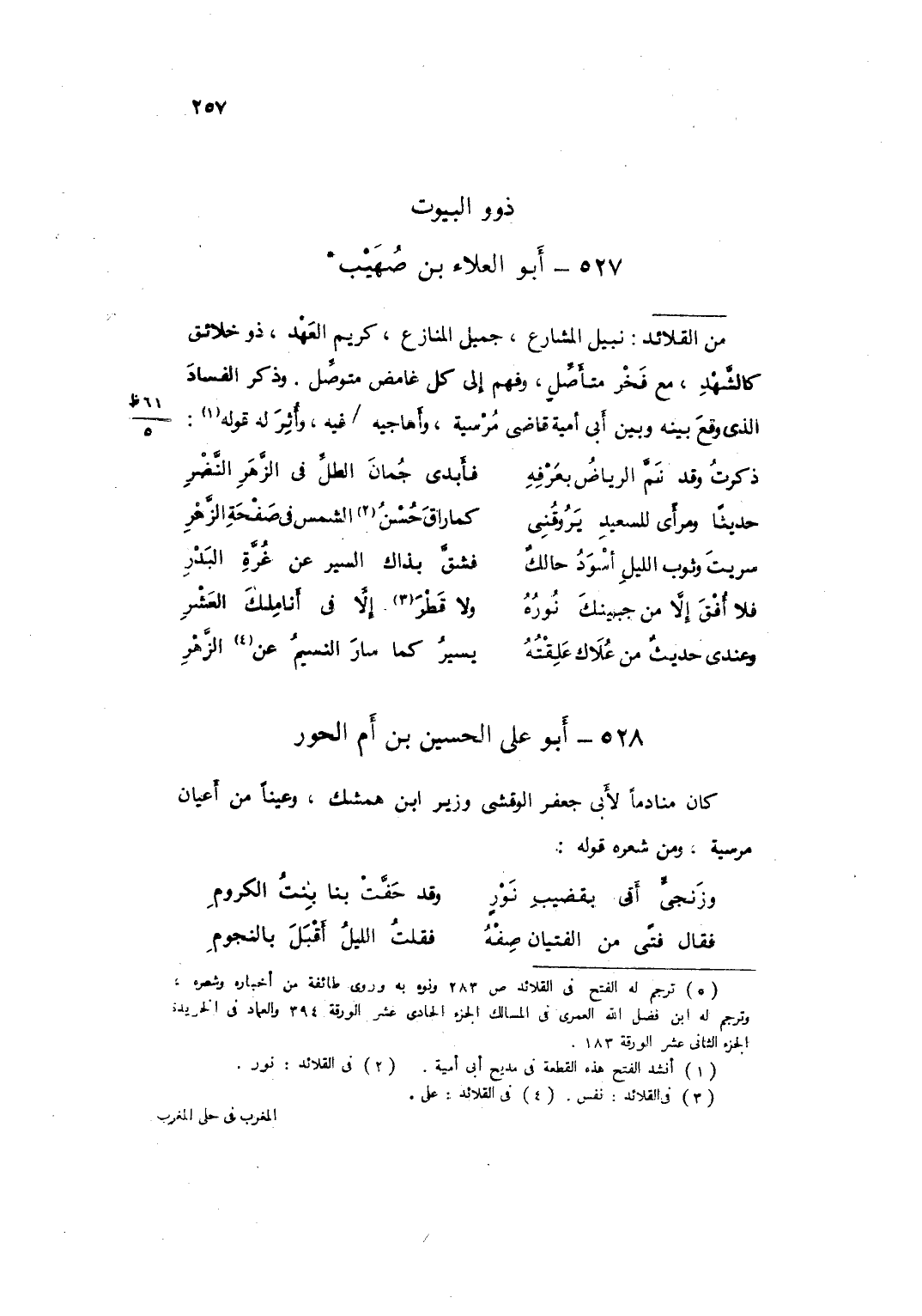 سَرَيْتَ وثوب اللَّيْل اسود حالك ... فشق بِذَاكَ السَّيْرِ عَنْ غُرَّةِ البَدْرِ ... 1 ... فَلا أُفْقَ إِلاَّ مِنْ جَبِينِكَ نُورُهُ ... وَلا قَطْرَ إِلاَّ فِي أَنَامِلِكَ العَشْرِ