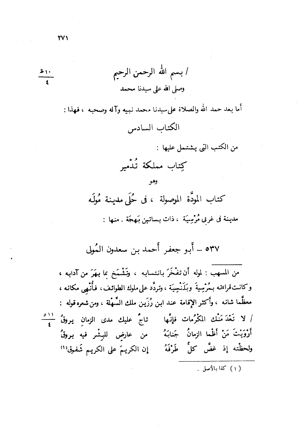 أما بعد حمد الله وَالصَّلَاة على سيدنَا مُحَمَّد بنيه وَآله وَصَحبه فَهَذَا الْكتاب السَّادِس من الْكتب الَّتِي يشْتَمل عَلَيْهَا كتاب مملكة تدمير وَهُوَ كتاب الْمَوَدَّة الموصولة فِي حلي مَدِينَة مولة مَدِينَة فِي غربي مرسية ذَات بساتين بهجة مِنْهَا