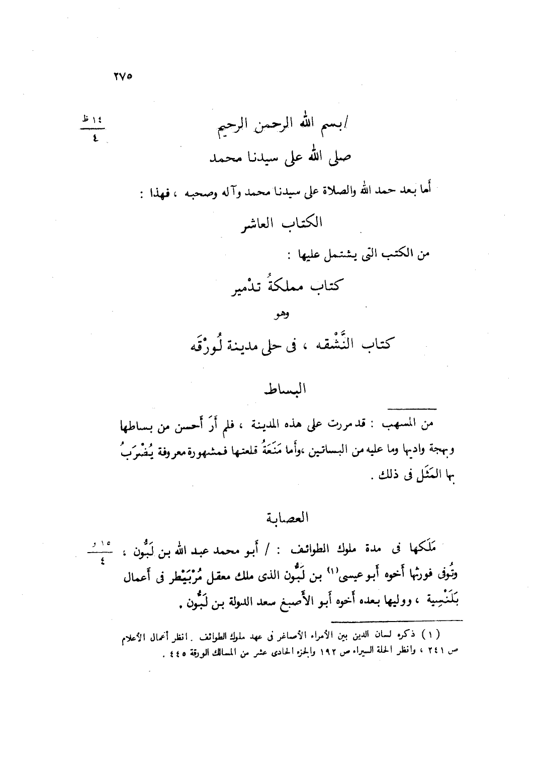 أما بعد حمد الله وَالصَّلَاة على سيدنَا مُحَمَّد وَآله وَصَحبه فَهَذَا الْكتاب الْعَاشِر من الْكتب الَّتِي يشْتَمل عَلَيْهَا مملكة تدمير وَهُوَ كتاب النشقة فِي حلي مَدِينَة لورقه