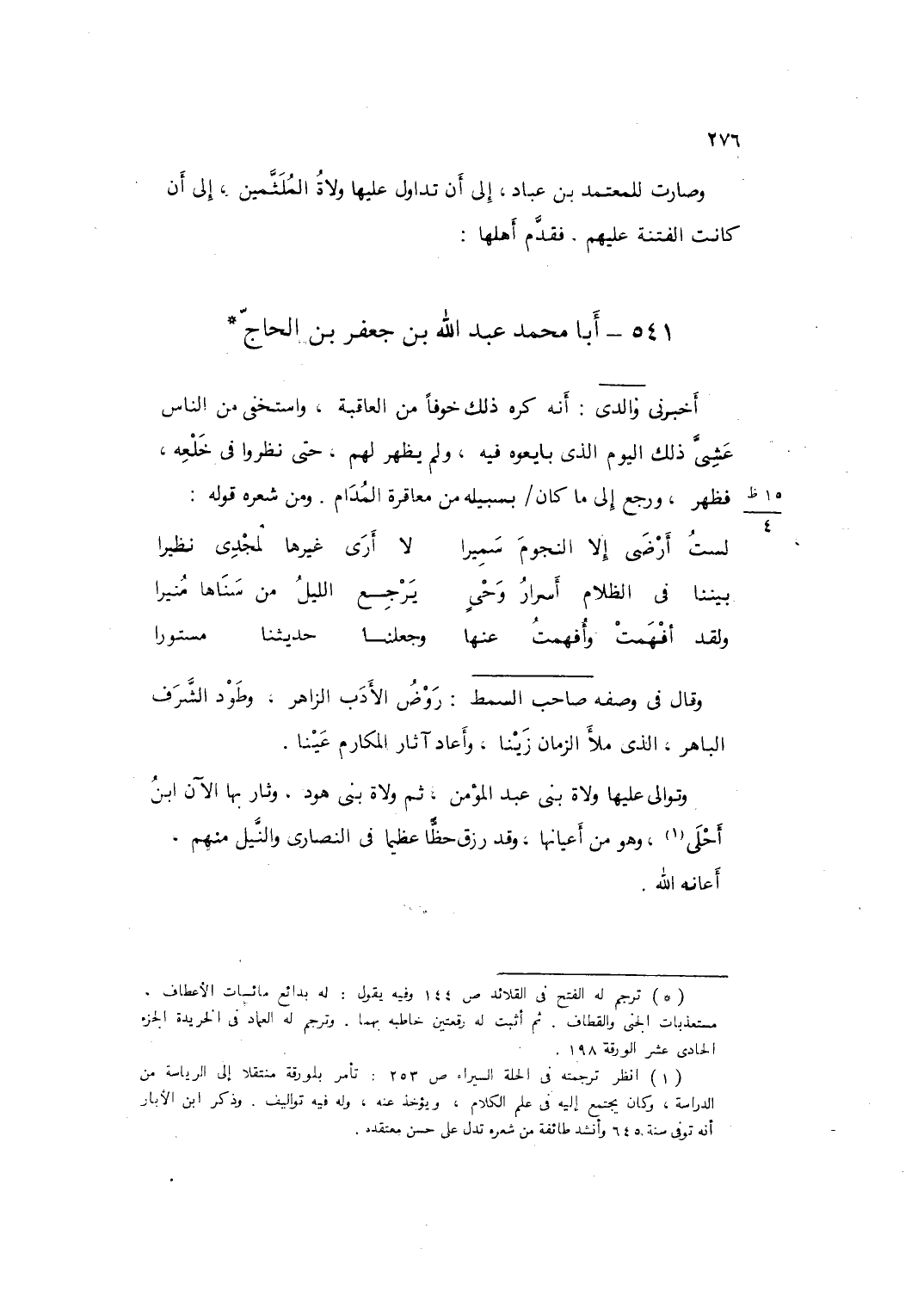 أَخْبرنِي وَالِدي أَنه كره ذَلِك خوفًا من الْعَاقِبَة واستخفى من النَّاس عشي ذَلِك الْيَوْم الَّذِي بَايعُوهُ فِيهِ وَلم يظْهر لَهُم حَتَّى نظرُوا فِي خلعه فَظهر وَرجع إِلَى مَا كَانَ بسبيله من معاقرة المدام وَمن شعره قَوْله ... لَسْتُ أَرْضَى إِلاَّ النُّجُومَ سَمِيرَا ... لَا أَرَى غَيْرَهَا لِمَجْدِي نَظِيْرَا