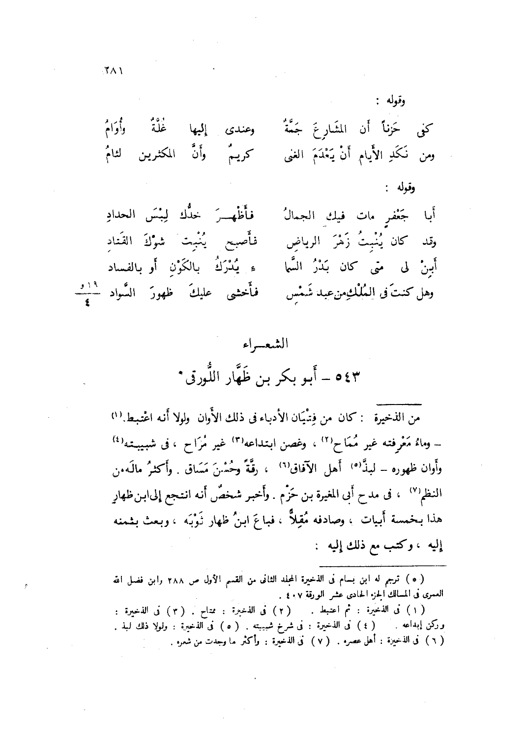 من الذَّخِيرَة كَانَ من فتيَان الأدباء فِي ذَلِك الأوان وَلَوْلَا أَنه اعتبط وَمَاء مَعْرفَته غير مماح وغصن ابتداعه غير مراح فِي شبيبته وَأَوَان ظُهُوره لبذ أهل الْآفَاق رقة وَحسن مساق وَأكْثر مَاله من النّظم فِي مدح أبي الْمُغيرَة بن حزم وَأخْبر شخص أَنه انتجع إِلَى ابْن ظِهَار هَذَا بِخَمْسَة أَبْيَات وصادفه مقلاً فَبَاعَ ابْن ظِهَار ثَوْبه وَبعث بِثمنِهِ إِلَيْهِ كتب مَعَ ذَلِك إِلَيْهِ