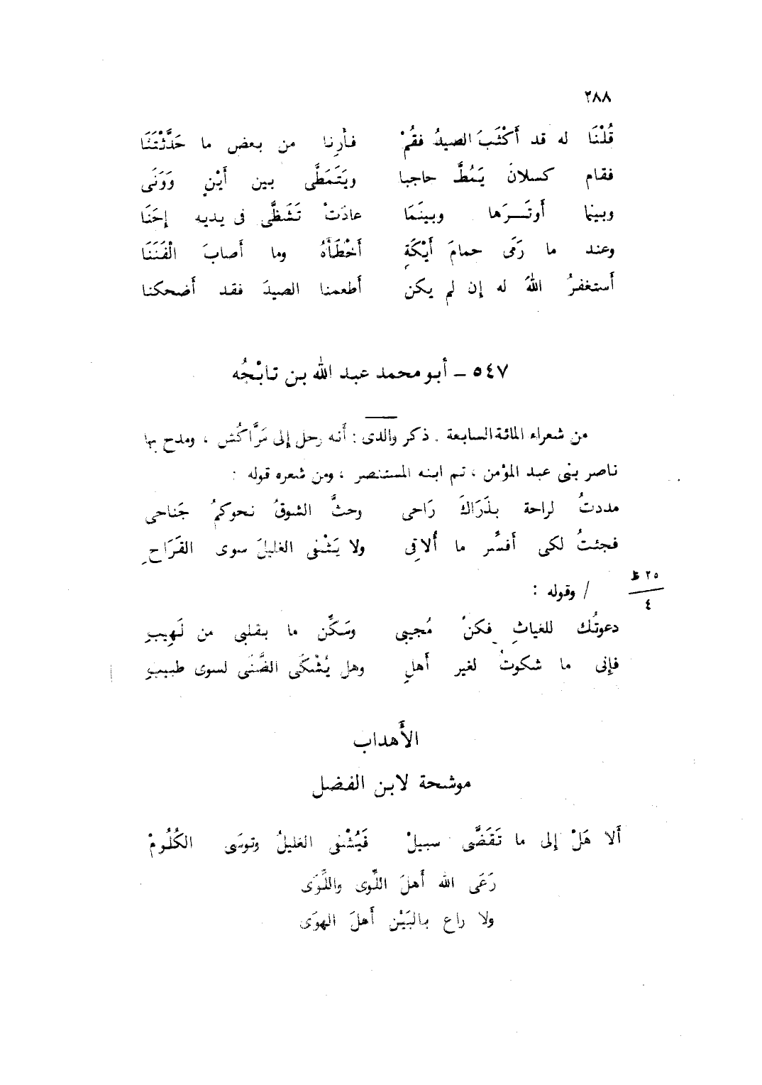 الْأَهْدَاب موشحة لِابْنِ الْفضل ... أَلا هَلْ إَلَى مَا تَقَضَّى سَبِيْلْ ... فَيُشْفِى الغَلِيْلُ وُتُوْسَى الكُلُوْمْ
