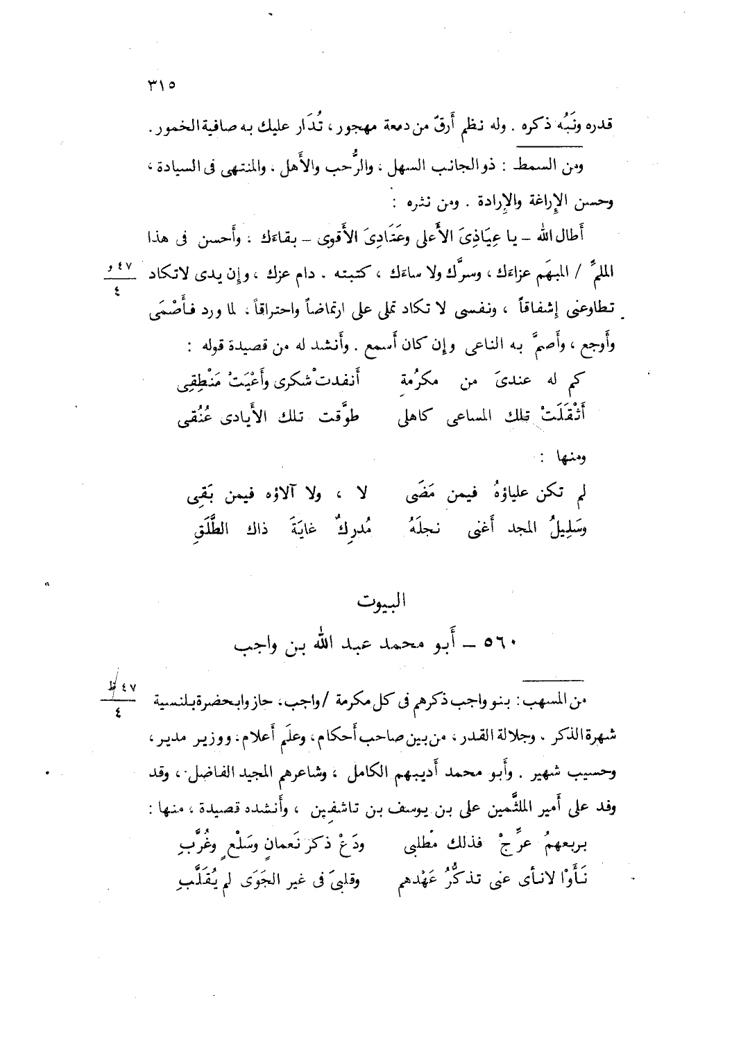 من المسهب بَنو وَاجِب ذكرهم فِي كل مكرمَة وَاجِب حازوا بِحَضْرَة بلنسية شهرة الذّكر وجلالة الْقدر من بَين صَاحب أَحْكَام وَعلم أَعْلَام ووزير مدير وحسيب شهير وَأَبُو مُحَمَّد أديبهم الْكَامِل وشاعرهم الْمجِيد الْفَاضِل وَقد وَفد على أَمِير الملثَّمين عَليّ بن يُوسُف بن تاشفِين وأنشده قصيدة مِنْهَا ... بربعهمُ عرِّجْ فَذَلِك مطلبي ... ودَعْ ذكر نَعمانٍ وسَلْعٍ وغُرَّبِ