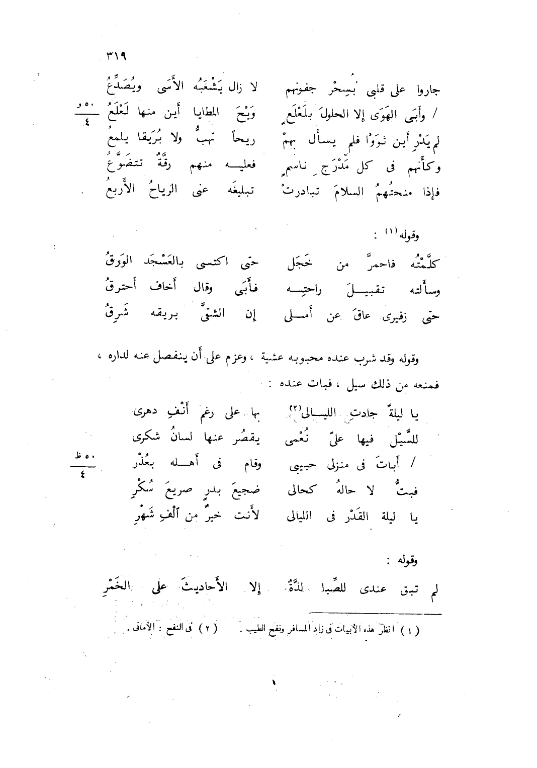 وَقَوله وَقد شرب عِنْده محبوبه عَشِيَّة وعزم على أَن ينْفَصل عَنهُ لداره فَمَنعه من ذَلِك سيل فَبَاتَ عِنْده ... يَا لَيْلَة جادتِ اللَّيَالِي ... بهَا على رغم أنْفِ دهري