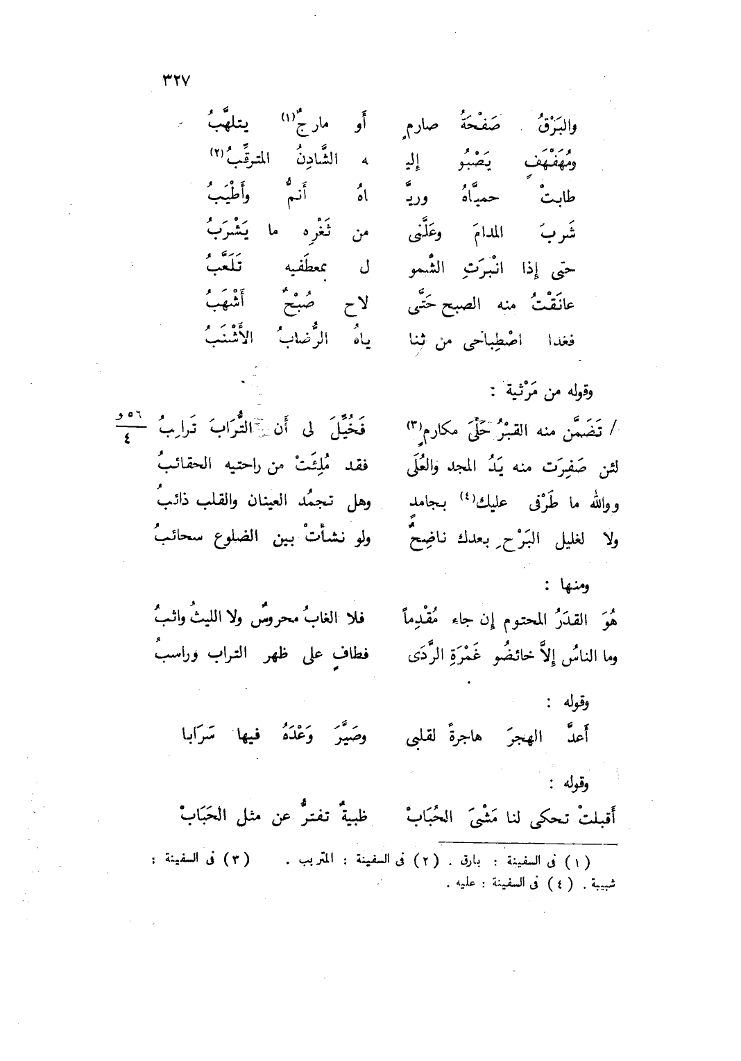وَقَوله من مَرْثية ... تَضَمَّن مِنْهُ القبْرُ حَلْيَ مكارمٍ ... فخُيِّلَ لي أَن التُّرابَ تُرَاب