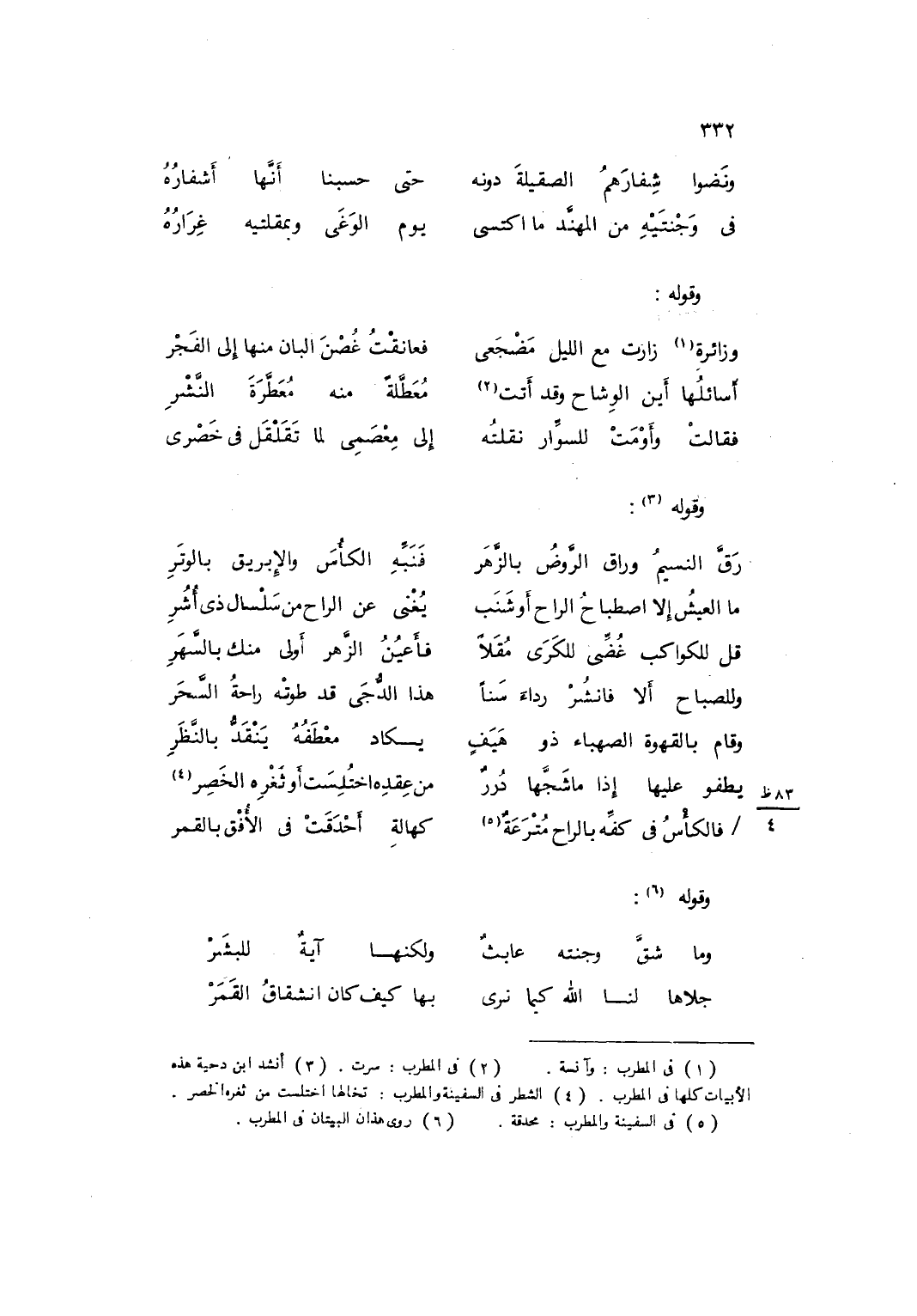 وَقَوله ... رَقَّ النسيمُ وراق الرَّوضُ بالزَّهَر ... فَنَبِّهِ الكأسَ والإبريق بالوَتَرِ