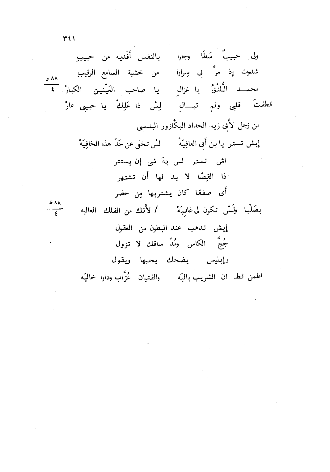 من زجل لأبي زيد الْحداد البكارزور البلنسي ... أيش تستر يَا بن أبي العافيَهْ ... لسْ تخفي عَن حَدّ هَذَا الخافِيَهْ