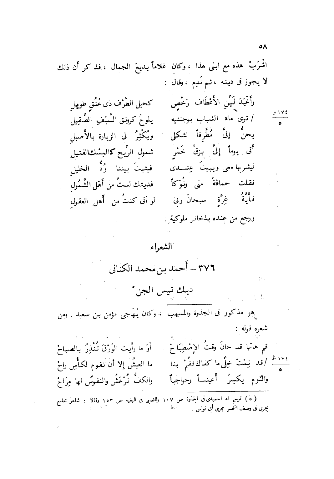 اشرب هَذِه مَعَ ابْني هَذَا وَكَانَ غُلَاما بديع الْجمال فَذكر أَن ذَلِك لَا يجوز فِي دينه ثمَّ نَدم وَقَالَ ... وَأَغْيَدَ ليِّنِ الأَعْطَافِ رَخْصٍ ... كَحِيلِ الطَّرْفِ ذِي عُنْقٍ طَوِيلِ
