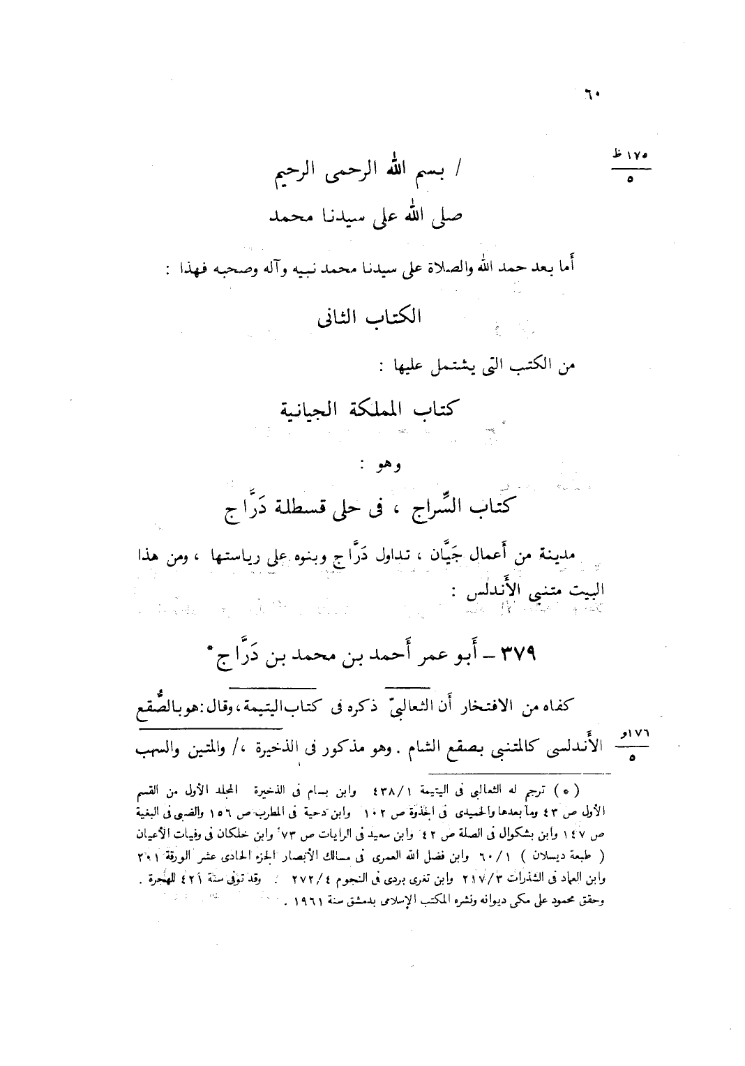 أما بعد حمد الله وَالصَّلَاة على سيدنَا مُحَمَّد نبيه وَآله وَصَحبه فَهَذَا الْكتاب الثَّانِي من الْكتب الَّتِي يشْتَمل عَلَيْهَا كتاب المملكة الجيانية وَهُوَ كتاب السراج فِي حلي قسطلة دراج مَدِينَة من أَعمال جيان تداول دراج وَبَنوهُ على رياستها وَمن هَذَا الْبَيْت متنبي الأندلس