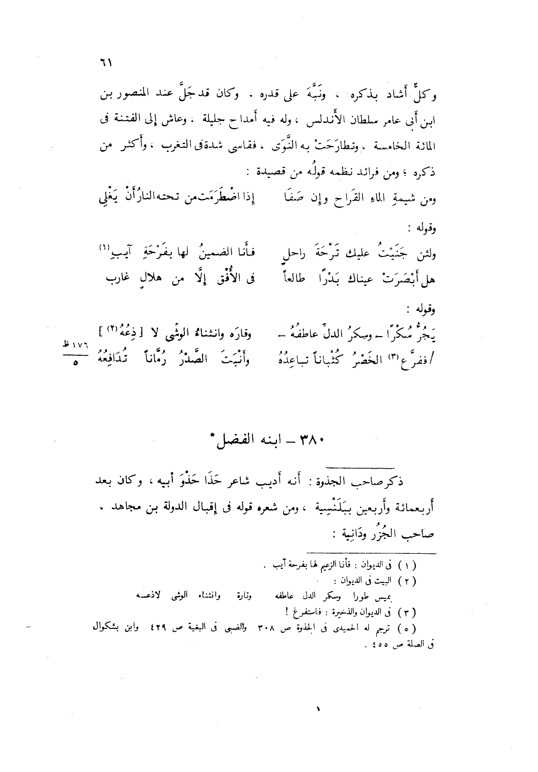 وكل أشاد بِذكرِهِ وَنبهَ على قدره وَكَانَ قد جلّ عِنْد الْمَنْصُور بن ابْن أبي عَامر سُلْطَان الأندلس وَله فِيهِ أمداح جليلة وعاش إِلَى الْفِتْنَة فِي الْمِائَة الْخَامِسَة وتطارحت بِهِ النَّوَى فقاسى شدَّة فِي التغرب وَأكْثر من ذكره وَمن فرائد نظمه قَوْله من قصيدة ... وَمِنْ شيمَةِ المَاءِ القَرَاحِ وَإنْ صفا ... إِذا اضْطَرَمَتْ مِنْ تَحْتِهِ النَّارُ أنْ يَغْلِيَ ...