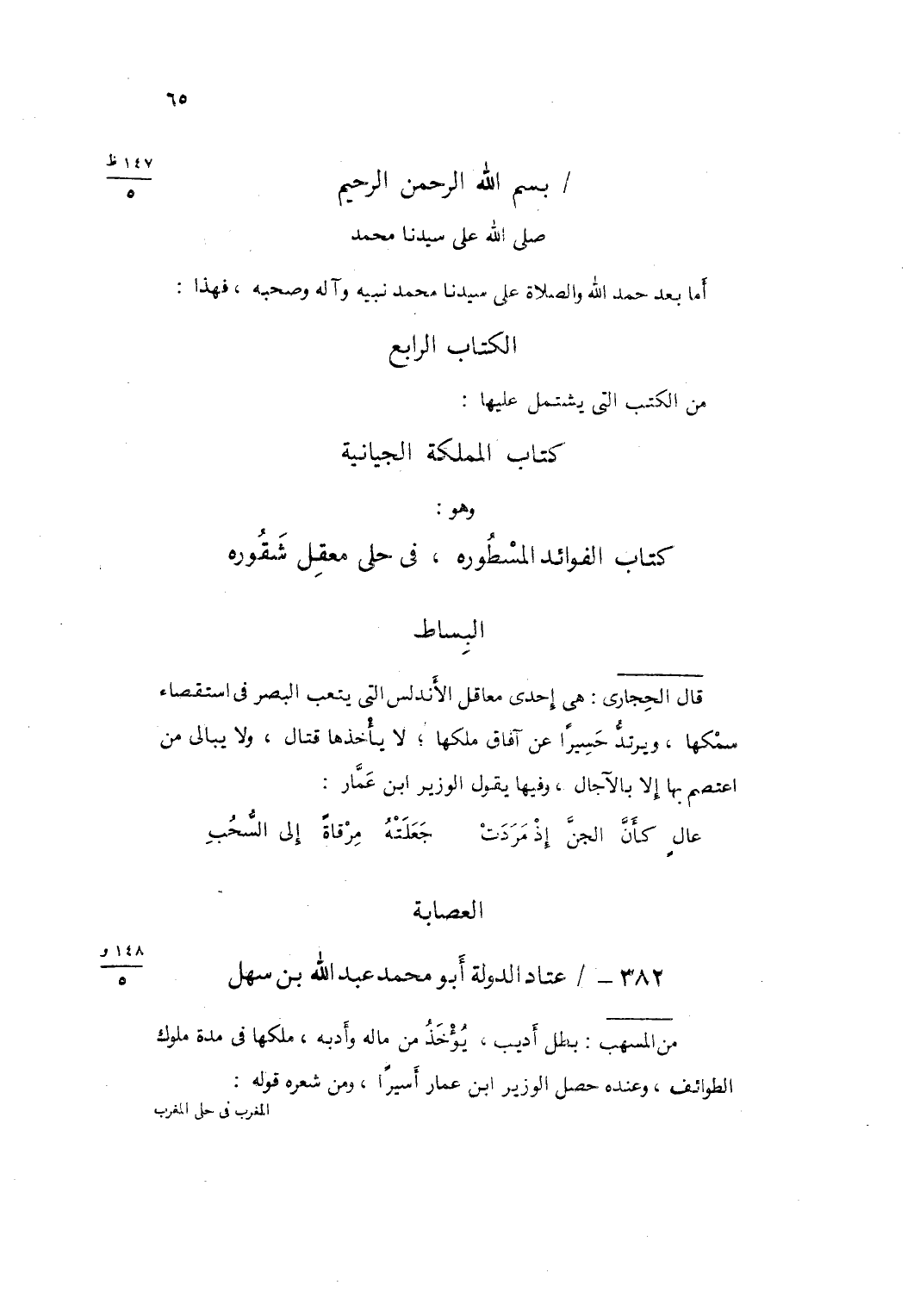 بِسم الله الرَّحْمَن الرَّحِيم صلى الله على سيدنَا مُحَمَّد أما بعد حمد الله وَالصَّلَاة على سيدنَا مُحَمَّد نبيه وَآله وَصَحبه فَهَذَا الْكتاب الرَّابِع من الْكتب الَّتِي يشْتَمل عَلَيْهَا كتاب المملكة الجيانية وَهُوَ كتاب الْفَوَائِد المسطورة فِي حلى معقل شقورة