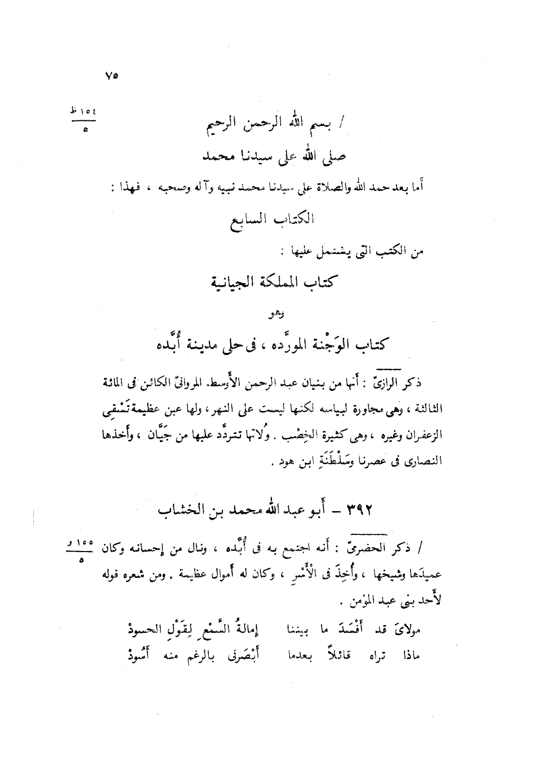 أما بعد حمد الله وَالصَّلَاة على سيدنَا مُحَمَّد نبيه وَآله وَصَحبه فَهَذَا الْكتاب السَّابِع من الْكتب الَّتِي يشْتَمل عَلَيْهَا كتاب الجيانية وَهُوَ كتاب الوجنة الموردة فِي حلي مَدِينَة أبدة 3 ذكر الرَّازِيّ أَنَّهَا من بُنيان عبد الرَّحْمَن الْأَوْسَط المرواني الْكَائِن فِي الْمِائَة الثَّالَّةِ وَهِي مجاورة لبياسة لَكِنَّهَا لَيست على النَّهر وَلها عين عَظِيمَة تَسْقِي الزَّعْفَرَان وَغَيره وَهِي كَثِيرَة الخصب ولاتها تَتَرَدَّد عَلَيْهَا من جيان وَأَخذهَا النَّصَارَى فِي عصرنا وسلطنة ابْن هود