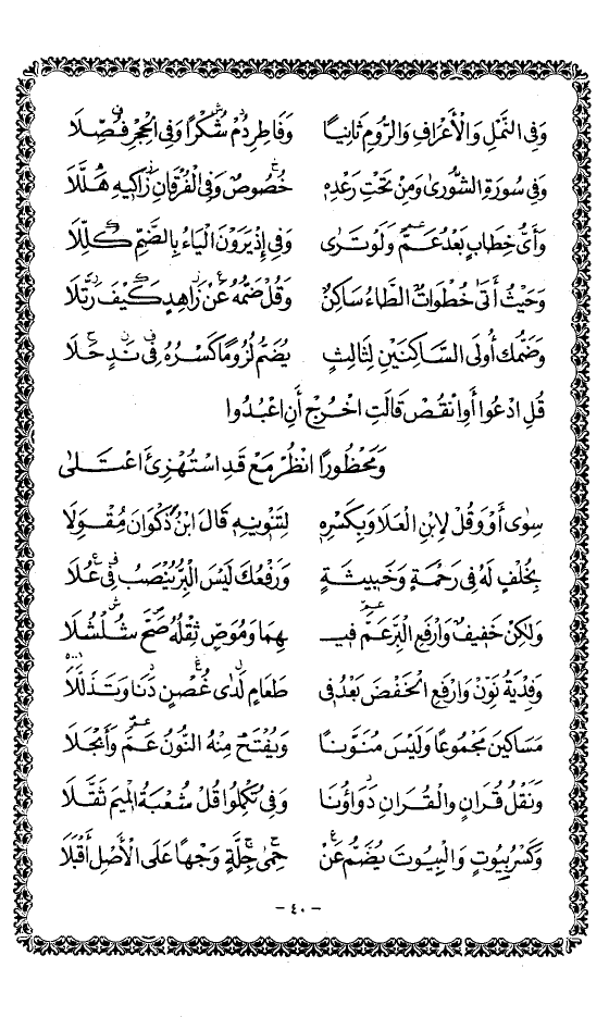 491 - وَفي النَّمْلِ وَاْلأَعْرَافِ وَالرُّومِ ثَانِياً ... وَفَاطِرِ دُمْ شُكْراً وَفي الْحِجْرِ فُصِّلَا