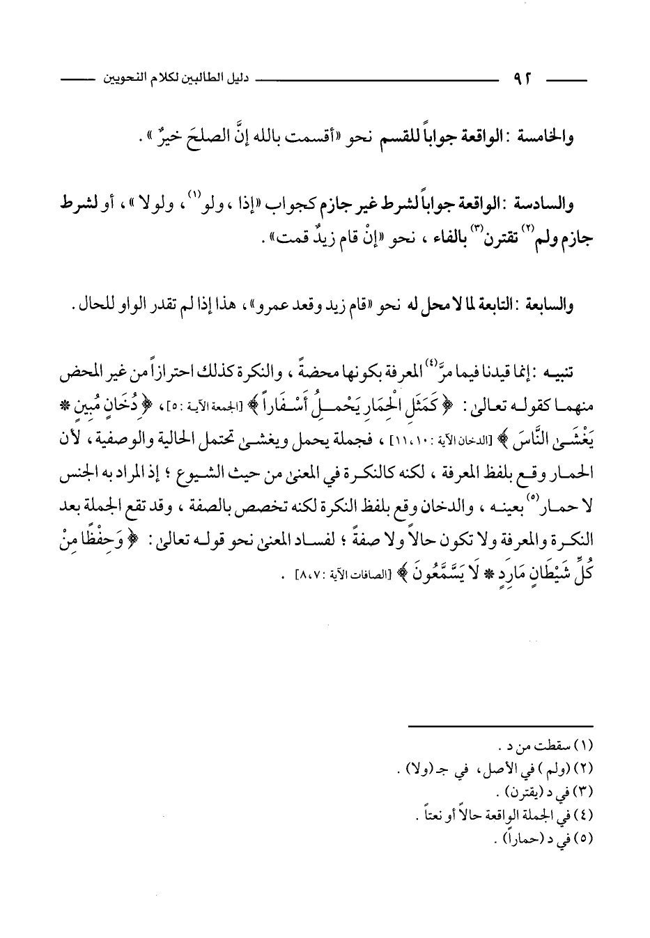 لا حمار بعينه، والدخان وقع بلفظ النكرة لكنه تخصص بالصفة، وقد تقع الجملة بعد النكرة والمعرفة ولا تكون حالاً ولا صفةً؛ لفساد المعنى نحو قوله تعالى: (وَحِفْظا مِنْ كُلِّ شَيْطَانٍ مَارِدٍ لَا يَسَّمَّعُونَ) .
