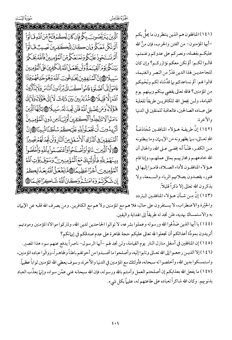 المنافقون هم الذين ينتظرون ما يحلُّ بكم -أيها المؤمنون- من الفتن والحرب، فإن منَّ الله عليكم بفضله، ونصركم على عدوكم وغنمتم، قالوا لكم: ألم نكن معكم نؤازركم؟ وإن كان للجاحدين لهذا الدين قَدْرٌ من النصر والغنيمة، قالوا لهم: ألم نساعدكم بما قدَّمناه لكم ونَحْمِكُم من المؤمنين؟ فالله تعالى يقضي بينكم وبينهم يوم القيامة، ولن يجعل الله للكافرين طريقًا للغلبة على عباده الصالحين، فالعاقبة للمتقين في الدنيا والآخرة.