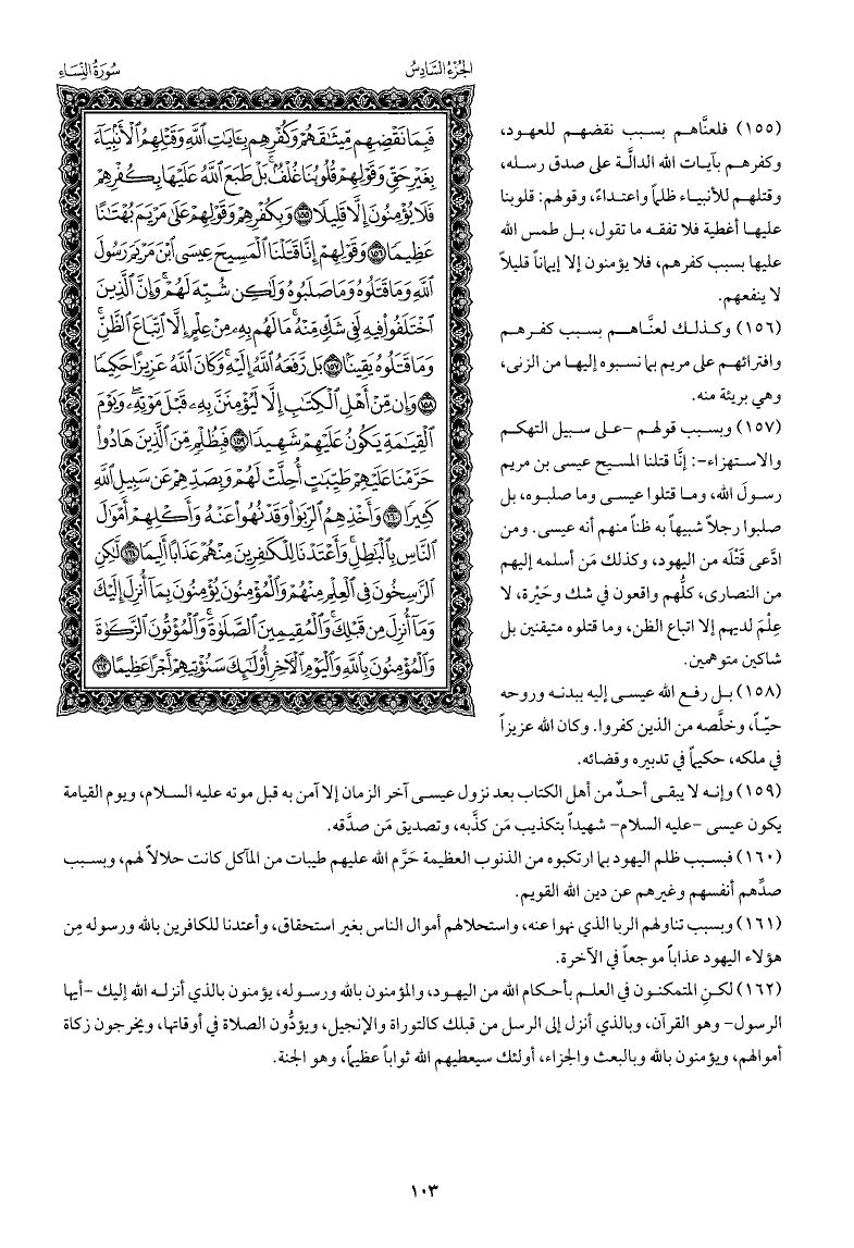 وإنه لا يبقى أحدٌ من أهل الكتاب بعد نزول عيسى آخر الزمان إلا آمن به قبل موته عليه السلام، ويوم القيامة يكون عيسى -عليه السلام- شهيدًا بتكذيب مَن كذَّبه، وتصديق مَن صدَّقه.