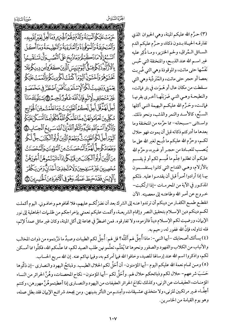 حرَّم الله عليكم الميتة، وهي الحيوان الذي تفارقه الحياة بدون ذكاة، وحرَّم عليكم الدم السائل المُراق، ولحم الخنزير، وما ذُكِر عليه غير اسم الله عند الذبح، والمنخنقة التي حُبِس نَفَسُها حتى ماتت، والموقوذة وهي التي ضُربت بعصا أو حجر حتى ماتت، والمُتَرَدِّية وهي التي سقطت من مكان عال أو هَوَت في بئر فماتت، والنطيحة وهي التي ضَرَبَتْها أخرى بقرنها فماتت، وحرَّم الله عليكم البهيمة التي أكلها السبُع، كالأسد والنمر والذئب، ونحو ذلك. واستثنى -سبحانه- مما حرَّمه من المنخنقة وما بعدها ما أدركتم ذكاته قبل أن يموت فهو حلال لكم، وحرَّم الله عليكم ما ذُبِح لغير الله على ما يُنصب للعبادة من حجر أو غيره، وحرَّم الله عليكم أن تطلبوا عِلْم ما قُسِم لكم أو لم يقسم بالأزلام، وهي القداح التي كانوا يستقسمون بها إذا أرادوا أمرًا قبل أن يقدموا عليه. ذلكم المذكور في الآية من المحرمات -إذا ارتُكبت- خروج عن أمر الله وطاعته إلى معصيته. الآن انقطع طمع الكفار من دينكم أن ترتدوا عنه إلى الشرك بعد أن نصَرْتُكم عليهم، فلا تخافوهم وخافوني. اليوم أكملت لكم دينكم دين الإسلام بتحقيق النصر وإتمام الشريعة، وأتممت عليكم نعمتي بإخراجكم من ظلمات الجاهلية إلى نور الإيمان، ورضيت لكم الإسلام دينًا فالزموه، ولا تفارقوه. فمن اضطرَّ في مجاعة إلى أكل الميتة، وكان غير مائل عمدًا لإثم، فله تناوله، فإن الله غفور له، رحيم به.