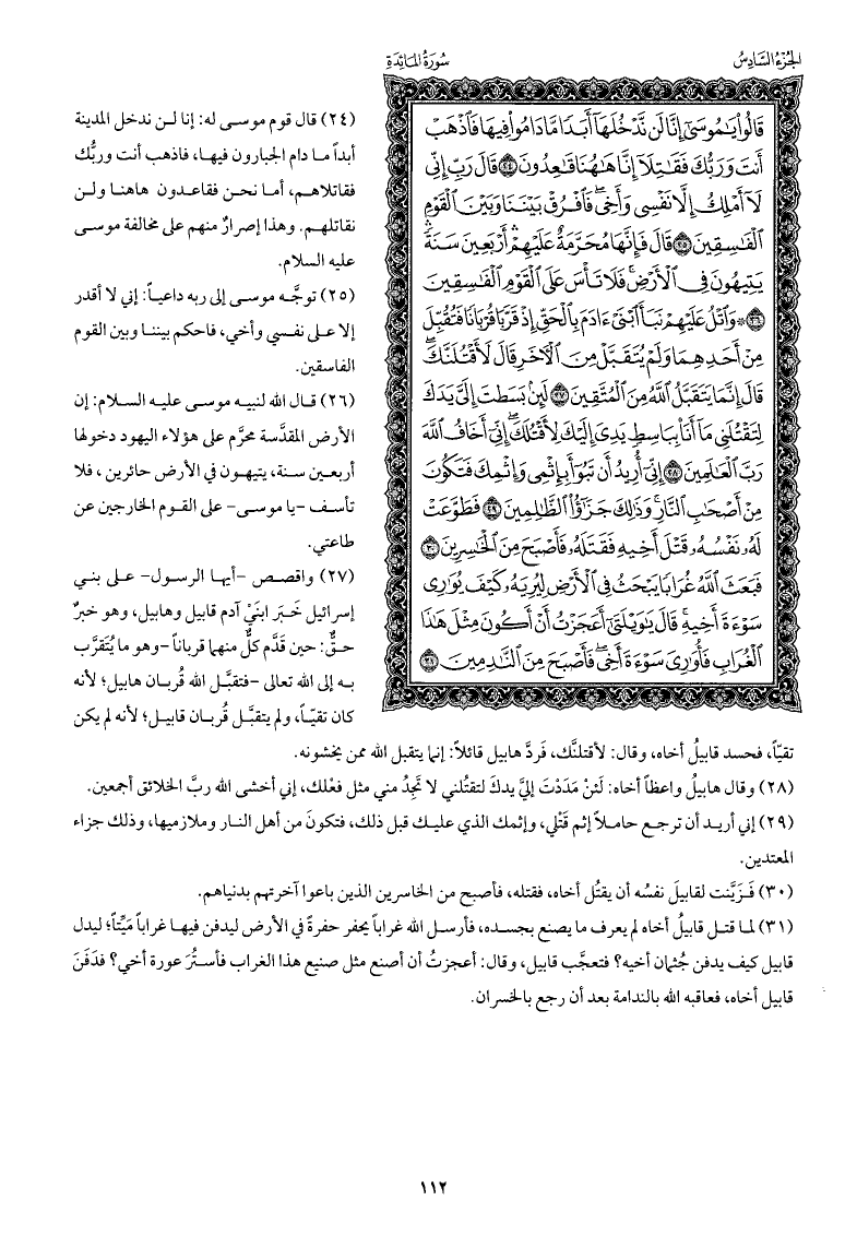 واقصص -أيها الرسول- على بني إسرائيل خَبَر ابنَيْ آدم قابيل وهابيل، وهو خبرٌ حقٌ: حين قَدَّم كلٌّ منهما قربانًا -وهو ما يُتَقرَّب به إلى الله تعالى- فتقبَّل الله قُربان هابيل; لأنه كان تقيًّا، ولم يتقبَّل قُربان قابيل; لأنه لم يكن تقيًّا، فحسد قابيلُ أخاه، وقال: لأقتلنَّك، فَردَّ هابيل: إنما يتقبل الله ممن يخشونه.