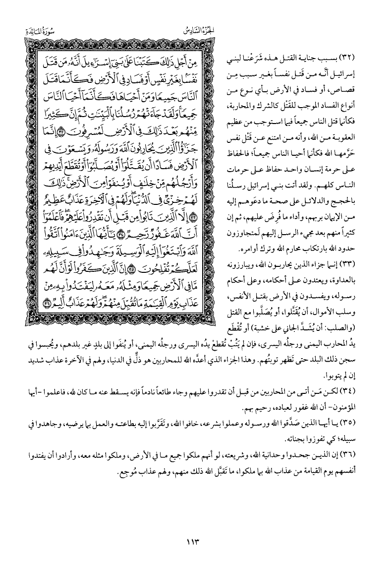 إنما جزاء الذين يحاربون الله، ويبارزونه بالعداوة، ويعتدون على أحكامه، وعلى أحكام رسوله، ويفسدون في الأرض بقتل الأنفس، وسلب الأموال، أن يُقَتَّلوا، أو يُصَلَّبوا مع القتل (والصلب: أن يُشَدَّ الجاني على خشبة) أو تُقْطَع يدُ المحارب اليمنى ورجله اليسرى، فإن لم يَتُبْ تُقطعْ يدُه اليسرى ورجلُه اليمنى، أو يُنفَوا إلى بلد غير بلدهم، ويُحبسوا في سجن ذلك البلد حتى تَظهر توبتُهم. وهذا الجزاء الذي أعدَّه الله للمحاربين هو ذلّ في الدنيا، ولهم في الآخرة عذاب شديد إن لم يتوبوا.