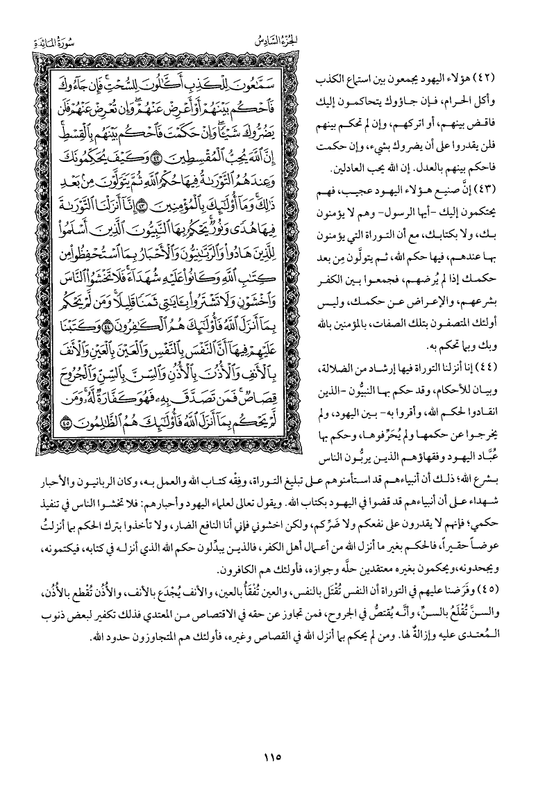 وفَرَضنا عليهم في التوراة أن النفس تُقْتَل بالنفس، والعين تُفْقَأ بالعين، والأنف يُجْدَع بالأنف، والأذُن تُقْطع بالأذُن، والسنَّ تُقْلَعُ بالسنِّ، وأنَّه يُقْتَصُّ في الجروح، فمن تجاوز عن حقه في الاقتصاص من المُعتدي فذلك تكفير لبعض ذنوب المعتدى عليه وإزالةٌ لها. ومن لم يحكم بما أنزل الله في القصاص وغيره، فأولئك هم المتجاوزون حدود الله.