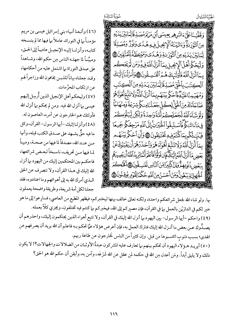 وأتبعنا أنبياء بني إسرائيل عيسى بن مريم مؤمنًا بما في التوراة، عاملا بما فيها مما لم ينسخه كتابه، وأنزلنا إليه الإنجيل هاديا إلى الحق، ومبيِّنًا لما جهله الناس مِن حكم الله، وشاهدًا على صدق التوراة بما اشتمل عليه من أحكامها، وقد جعلناه بيانًا للذين يخافون الله وزاجرًا لهم عن ارتكاب المحرَّمات.