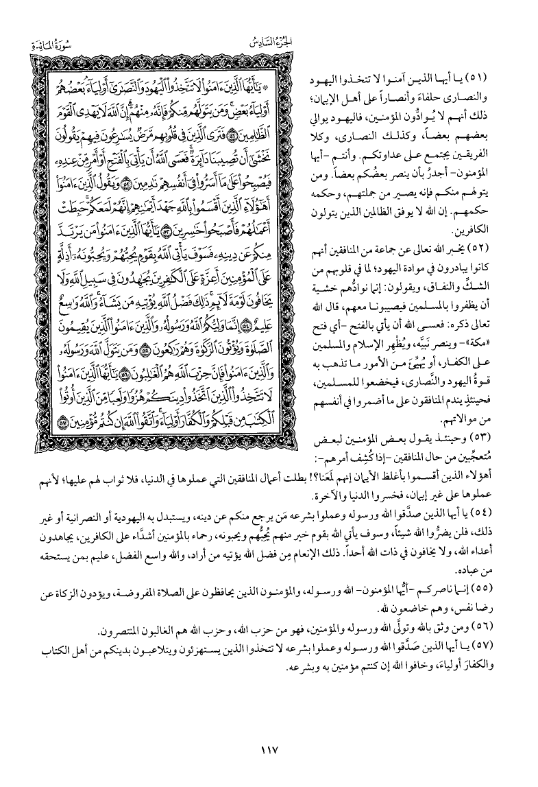 يا أيها الذين آمنوا لا تتخذوا اليهود والنصارى حلفاءَ وأنصارًا على أهل الإيمان; ذلك أنهم لا يُوادُّون المؤمنين، فاليهود يوالي بعضهم بعضًا، وكذلك النصارى، وكلا الفريقين يجتمع على عداوتكم. وأنتم -أيها المؤمنون- أجدرُ بأن ينصر بعضُكم بعضًا. ومن يتولهم منكم فإنه يصير من جملتهم، وحكمه حكمهم. إن الله لا يوفق الظالمين الذين يتولون الكافرين.