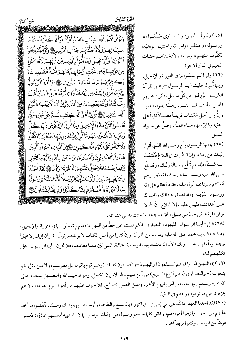 قل -أيها الرسول- لليهود والنصارى: إنكم لستم على حظٍّ من الدين ما دمتم لم تعملوا بما في التوراة والإنجيل، وما جاءكم به محمد صلى الله عليه وسلم من القرآن، وإن كثيرًا من أهل الكتاب لا يزيدهم إنزالُ القرآن إليك إلا تجبُّرًا وجحودًا، فهم يحسدونك; لأن الله بعثك بهذه الرسالة الخاتمة، التي بَيَّن فيها معايبهم، فلا تحزن -أيها الرسول- على تكذيبهم لك.